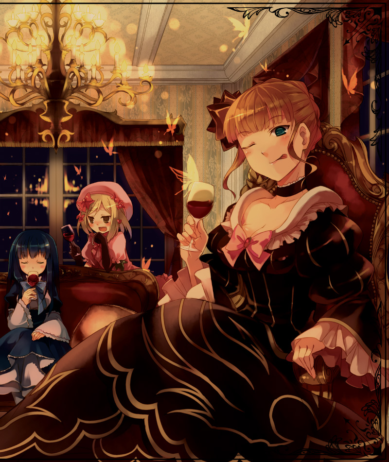 kuse (0201), formidable (azur lane), formidable (timeless classics) (azur lane), sirius (azur lane), azur lane, black neckwear, silver hair, absurdres, commentary, highres, 3girls, :d, absurdly long hair, adapted costume, animal ears, between breasts, black choker, black panties, black sailor collar, blush, breasts, choker, cleavage, cowboy shot, dress, fake animal ears, hair between eyes, hair ribbon, holding, holding own hair, indoors, large breasts, long hair, looking at viewer, multiple girls, navel, necktie, necktie between breasts, official alternate costume, open mouth, panties, rabbit ears, red eyes, ribbon, sailor collar, smile, standing, sweat, swimsuit, teeth, twintails, underwear, upper teeth only, very long hair, white dress, window