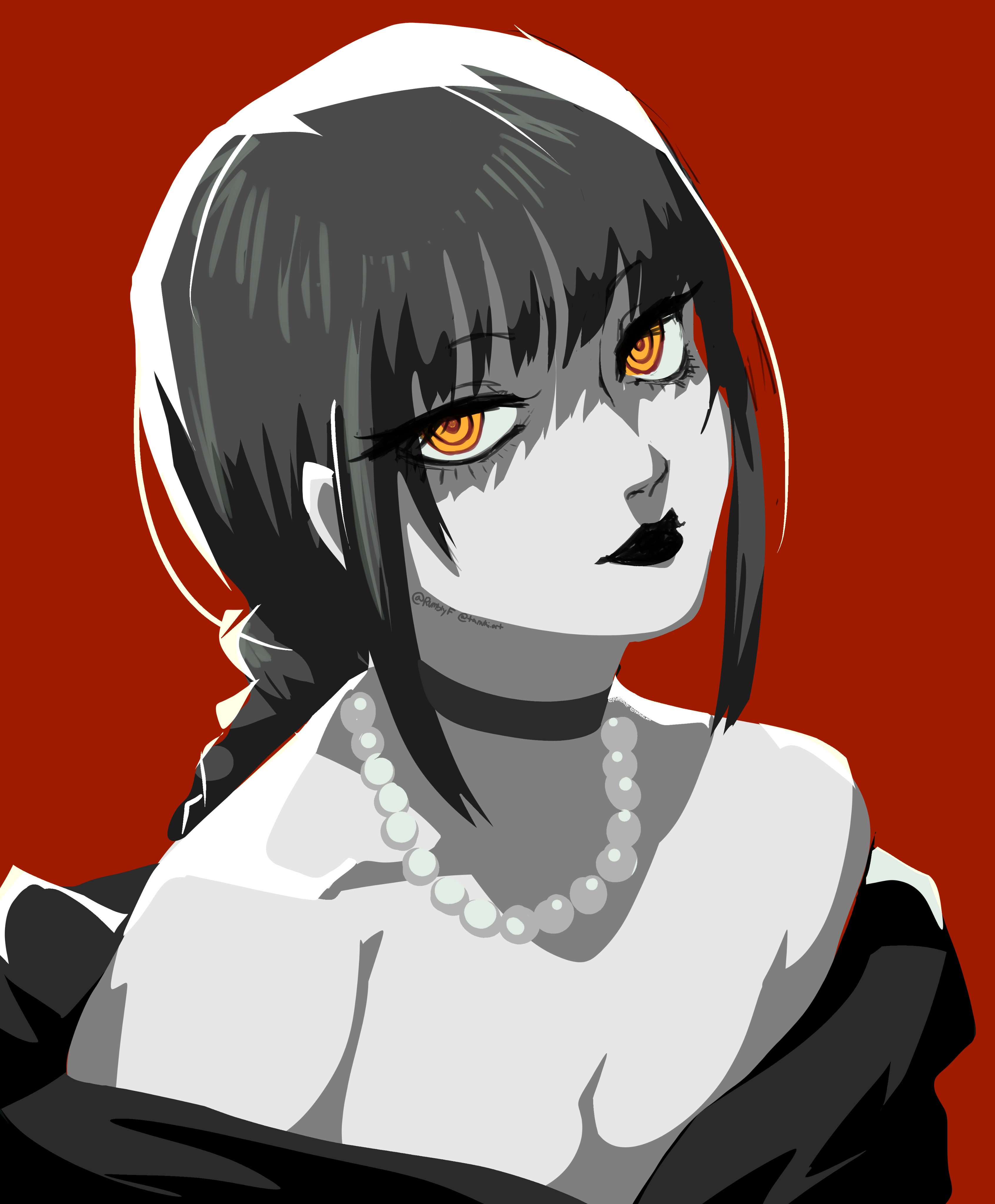 1girlbare shouldersblunt bangsbraidbraided ponytailchokerclosed moutheyelashesjewelrylooking at viewernecklacepearl necklacered backgroundringed eyessidelockssimple backgroundsolotwitter usernameupper bodyyellow eyes