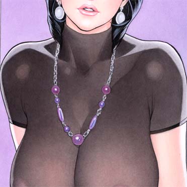 1girlblack hairbreastscleavageearringsfemale focushead out of frameimpossible clothesimpossible shirtjewelrynecklacesee-through clothesshirtskin tightsolo