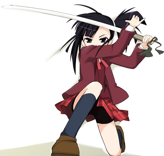 00sasymmetrical bangsbike shortsblack eyesblack hairlong hairplaid clothesplaid skirtschool uniformside ponytailskirtsoloswordweapon