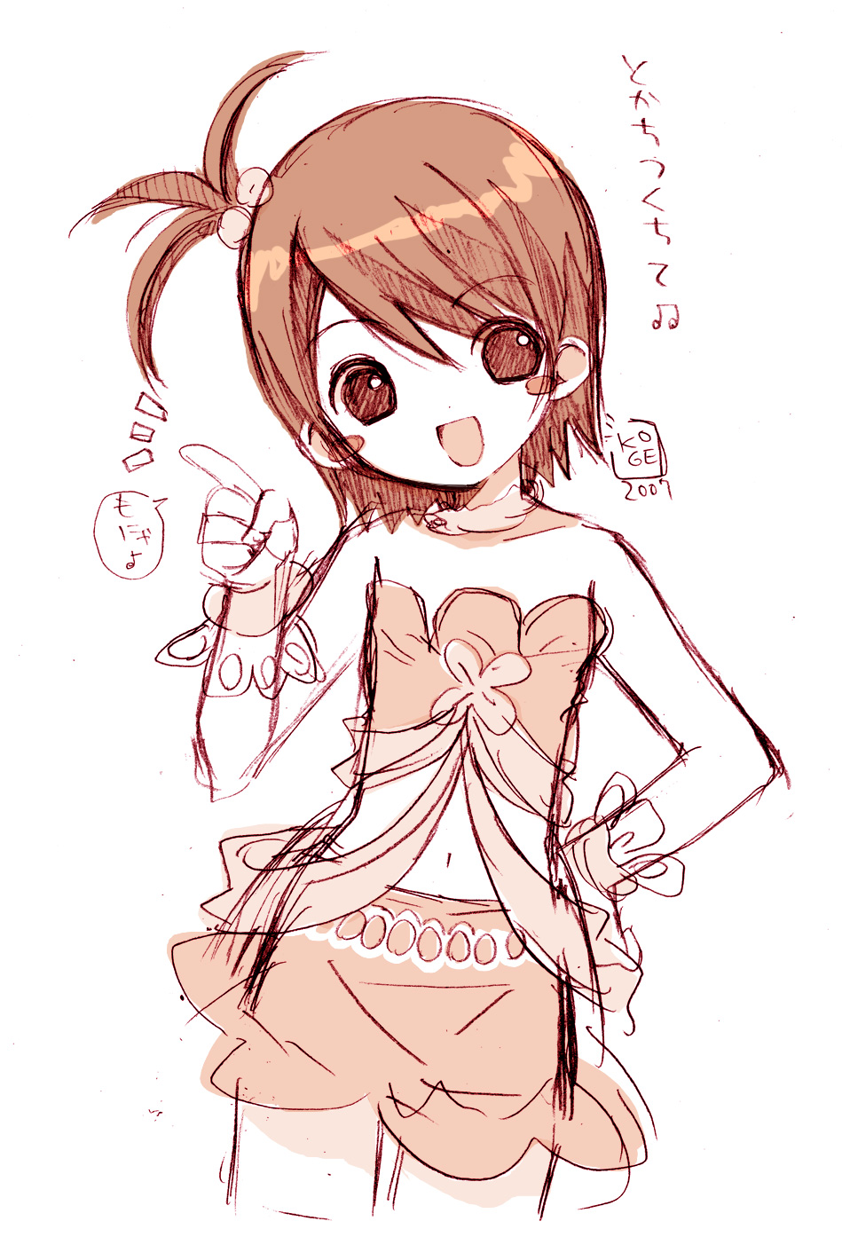 hane (hanegoya), minami tsubame, memories off, 1girl, arms at sides, backlighting, bare arms, bare shoulders, blue hair, brown eyes, closed mouth, collarbone, dress, dutch angle, female focus, flat chest, frilled dress, frills, looking at viewer, moon, moonlight, night, night sky, railing, short hair with long locks, sidelocks, sitting, sky, sleeveless, smile, solo, yellow dress