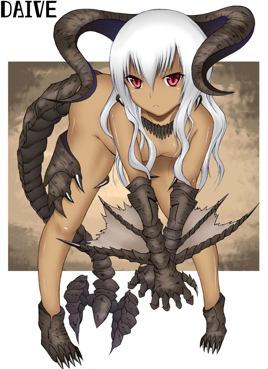 1girlbent overclawsdark skindark-skinned femalefemale focushornsjewelrylong hairmonster girlnecklacenudepersonificationred eyessolotailwhite hair