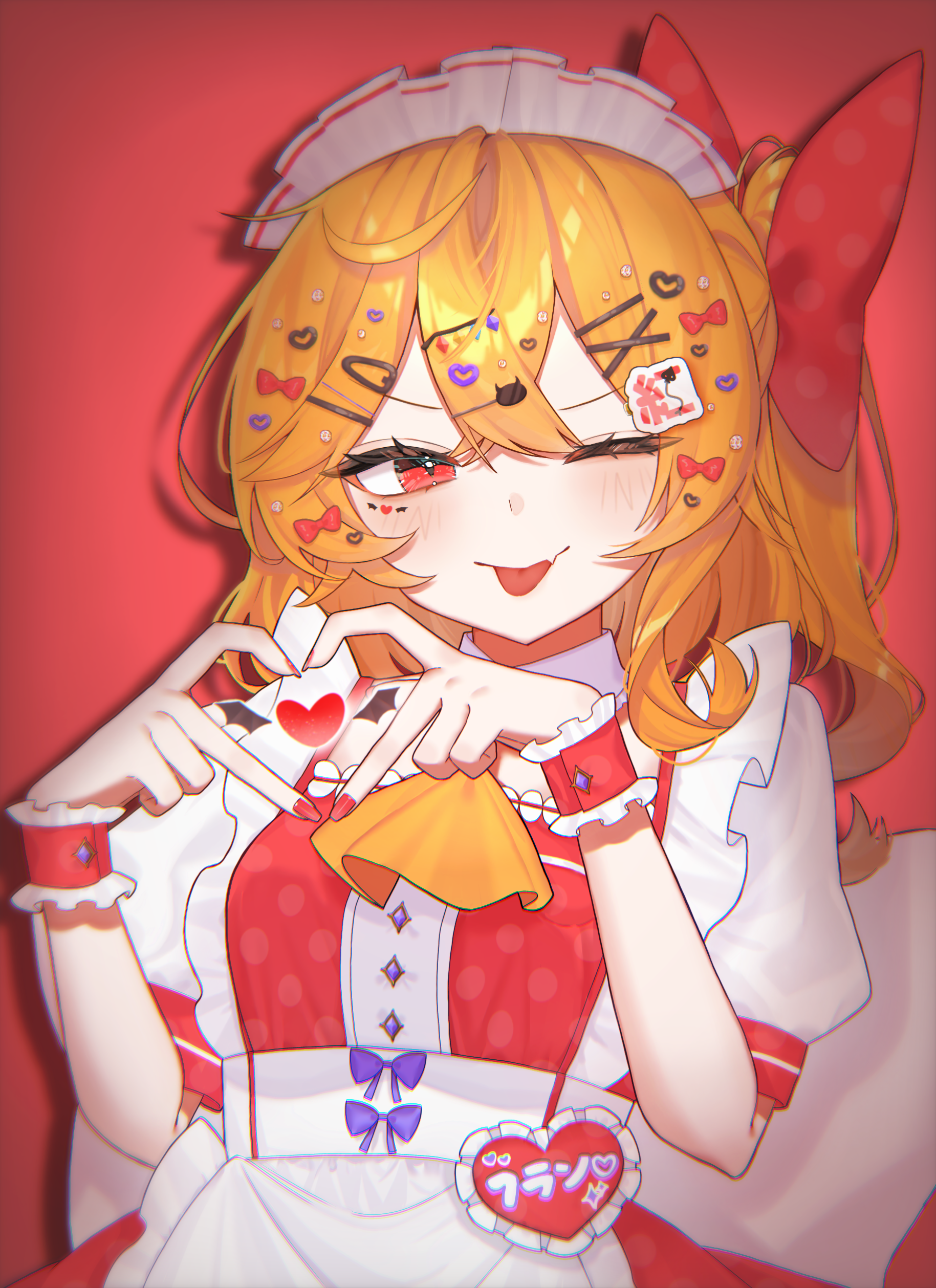 1girlalternate costumeapronascotblonde hairblushbowcowboy shothair ornamenthaircliphairpinheartheart handslong hairlooking at viewermaidmaid apronmaid headdressmultiple hairpinsnyaatsuone eye closedpuffy short sleevespuffy sleevesred backgroundred eyesshort sleevessmilesolotonguetongue outwrist cuffsyellow ascot