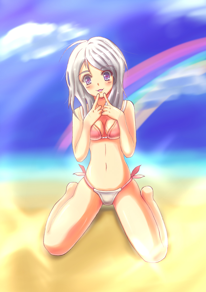 frapowa, tsukimura suzuka, lyrical nanoha, mahou shoujo lyrical nanoha, 00s, 1girl, bed, blue eyes, blush, breasts, female focus, large breasts, long hair, nipples, pillow, purple hair, sideboob, solo