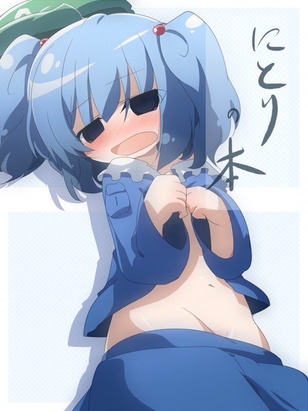 1girlblue eyesblue hairblushcharacter namecovercover pagecovering privatesempty eyesfemale focusgroinhatlolilyingmatching hair/eyesmidriffnavelon backopen clothesopen shirtshirtsolotearstwintailstwo side up