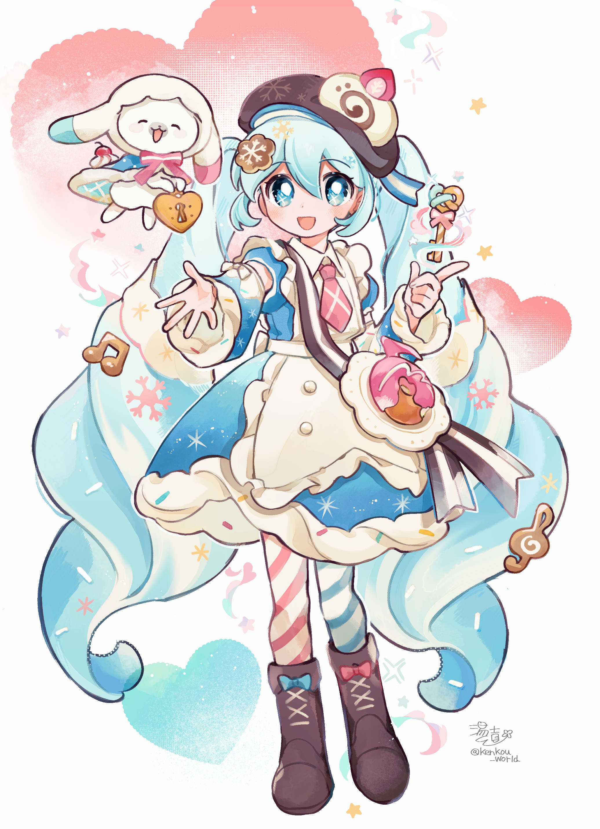 1girl1otherapronaqua eyesaqua hairblue dressbootsbrown bootscakeclosed mouthcookie hair ornamentdressfoodfood-themed hair ornamentfortissimofrilled apronfrillsfull bodyhair ornamentlong hairlong sleeveslooking at viewermusical notemusical note hair ornamentnecktiepink necktierabbitreachingreaching towards viewersoloswiss rolltwintailsvery long hairwhite apronwide sleeves