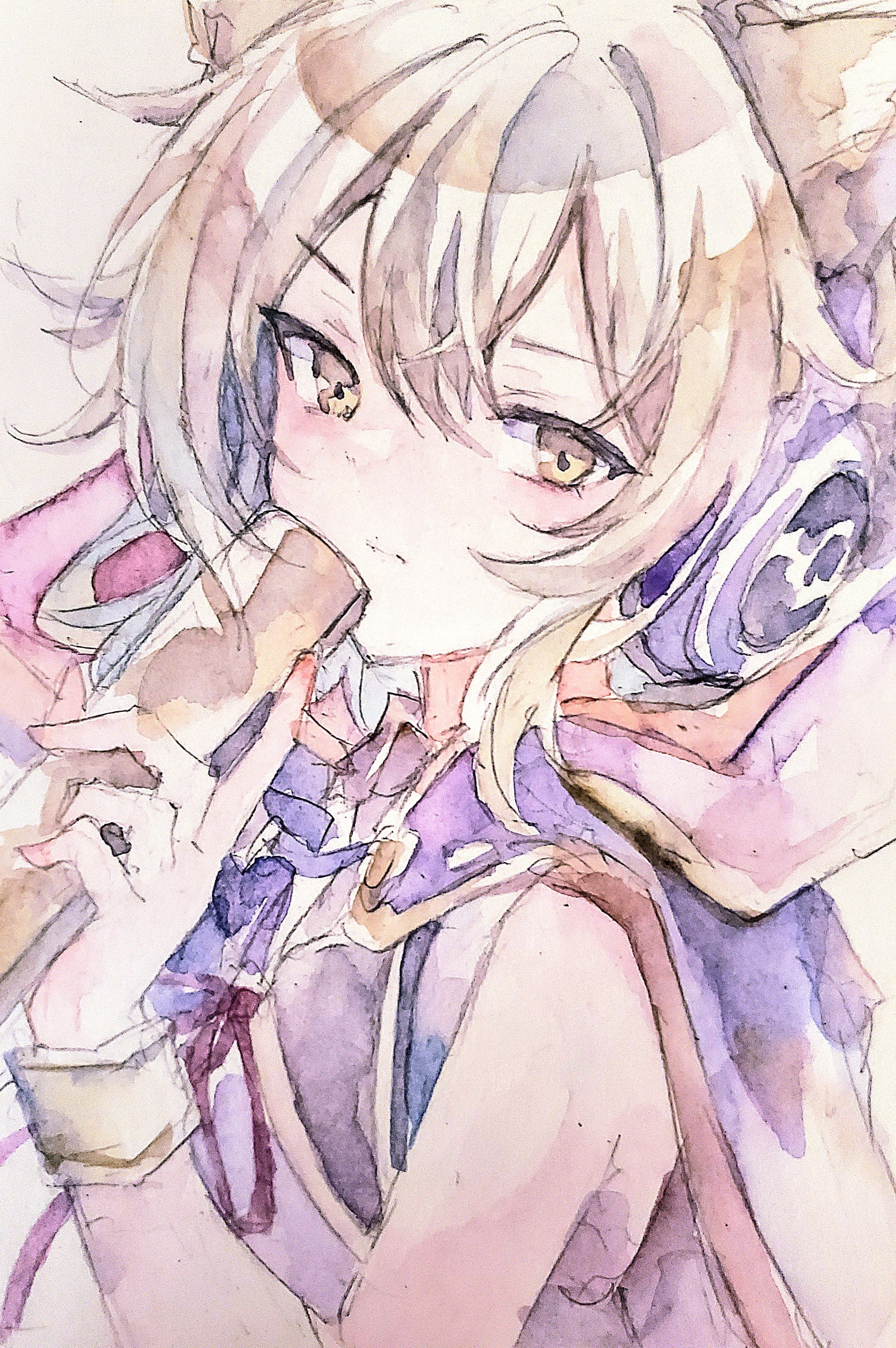 1girlbare shouldersblonde haircapeclosed mouthearmuffsearphonesexpressionlesshair between eyesholdinglooking at viewermedium hairpointy hairpurple caperitual batonshirtsleevelesssleeveless shirtsolowhite shirtyellow eyes