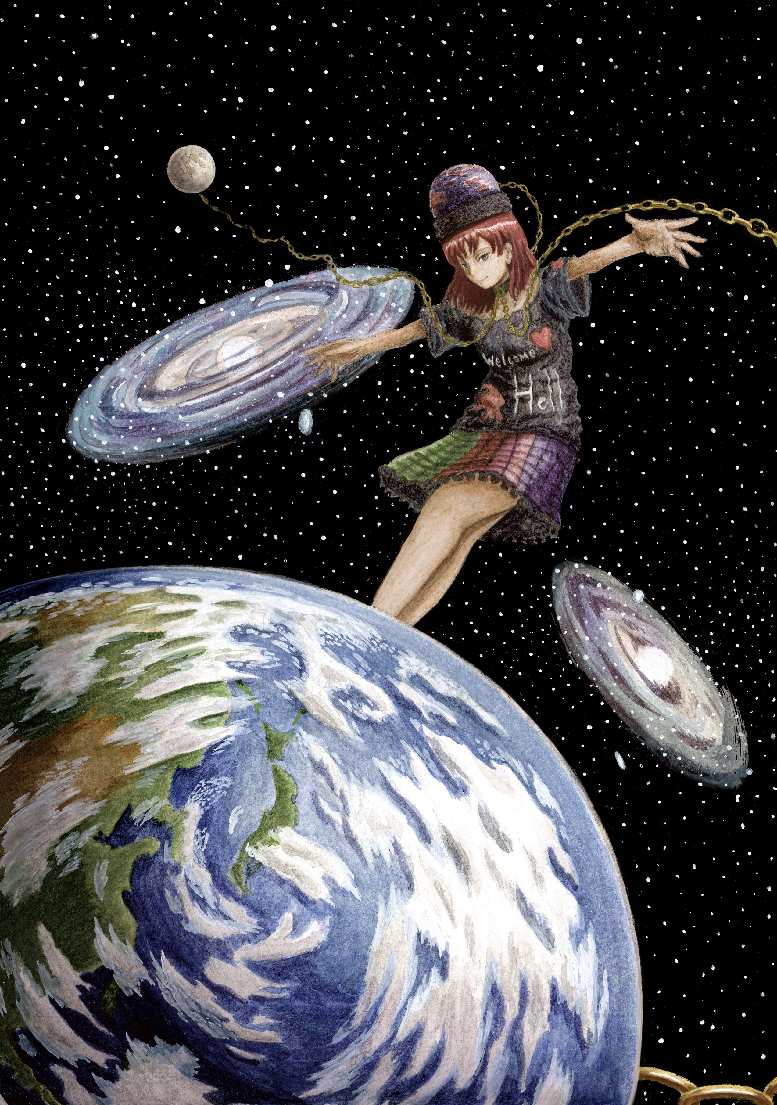 1girlblack shirtchainearth (ornament)frillsgalaxymedium hairmoon (ornament)multicolored skirtpandemonickaplaid clothesplaid skirtred eyesred hairshirtshort sleevesskirtsolospacet-shirtunderworld (ornament)