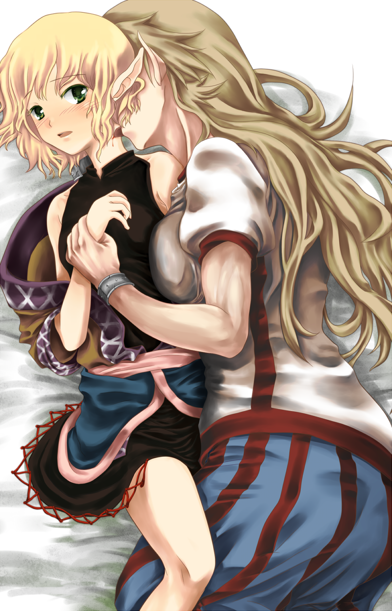 2girlsblonde hairbloodblushfemale focusholding another's wristlickinglyingmultiple girlsmuscularopen clothespointy earssleevelessyuri