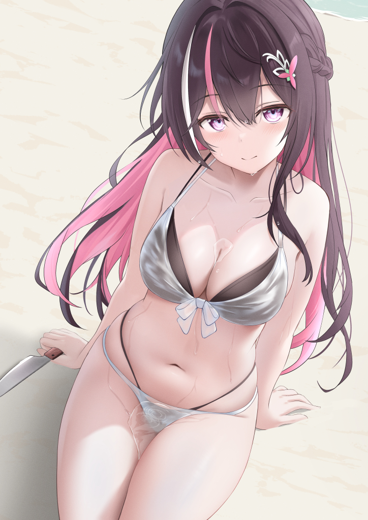 1girlarm supportbare shouldersbeachbikiniblushbraidbreastsbrown haircleavageclosed mouthcollarbonecolored inner hairdaydutch anglefrom abovefront-tie bikini topfront-tie tophair between eyeshair intakeshair ornamenthalterneckhand upholdingholding knifeknifelarge breastslayered bikinilong hairmulti-strapped bikini bottommulti-strapped bikini topmulticolored hairnaveloceanon groundoutdoorspink eyespink streaksplastic bottlesidelockssmilestomachstreaked hairstring bikinisunlightswimsuitthighsvery long hairvirtual youtuberwhite bikini