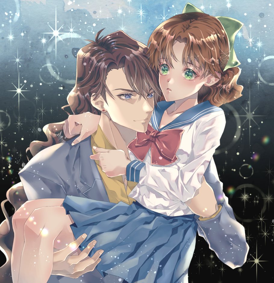 1boy1girlblue sailor collarblue skirtbowbrown haircarryingcarrying persongreen bowhair bowjuuban middle school uniformpleated skirtprincess carrysailor collarschool uniformshirtskirtwhite shirt