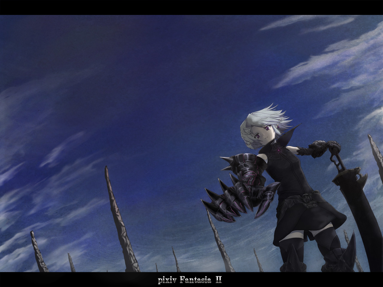 1girlarmorclawsearringsfemale focusgauntletsgreavesjewelryletterboxedpointy earspurple eyesskirtsoloswordthighhighsweapon