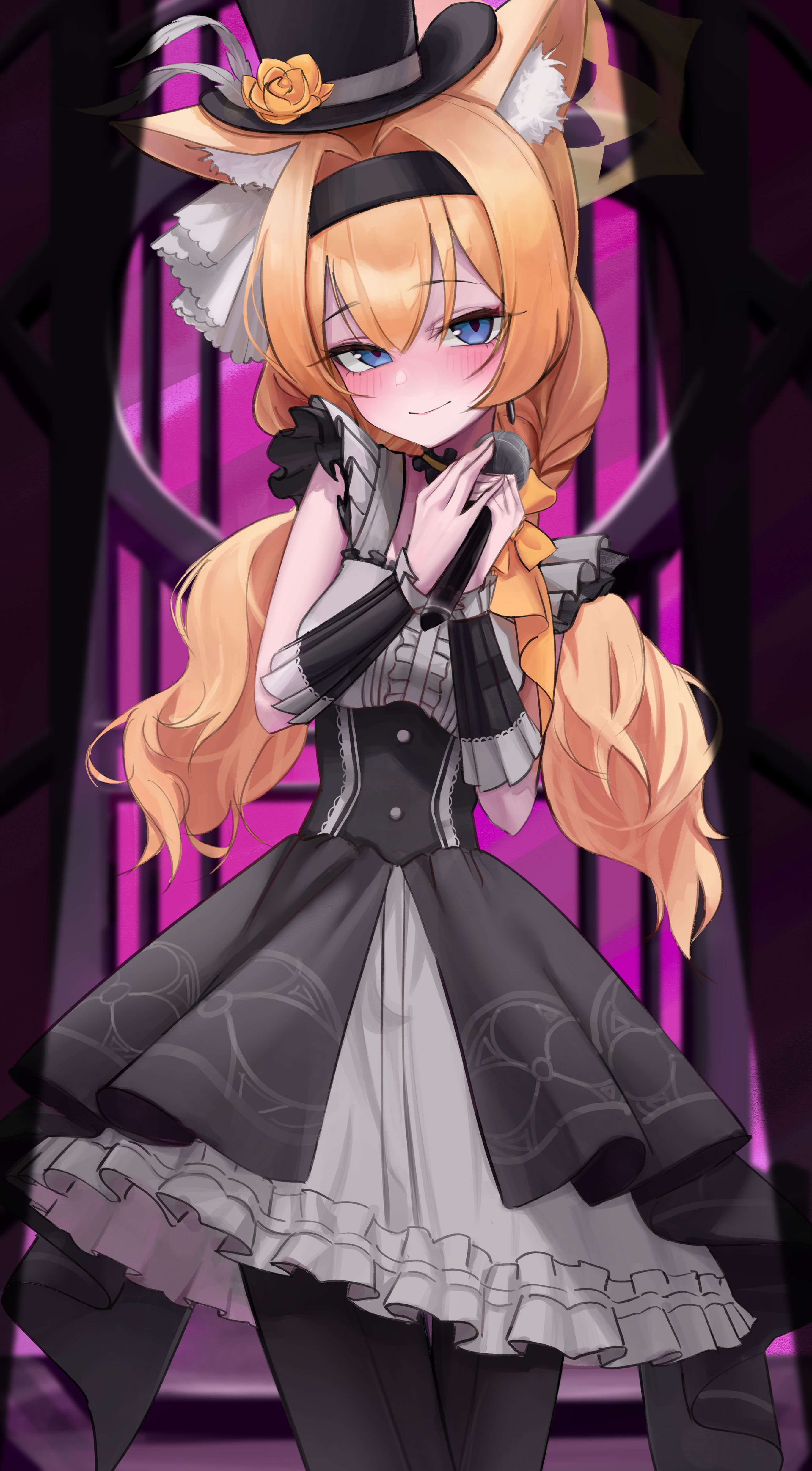 1girlanimal ear fluffanimal earsblack dressblack hairbandblack pantyhoseblue eyesblushcat earscat girlcenter frillschokerclosed mouthcowboy shotdressearringseyelashesflowerfrilled chokerfrilled dressfrillsgrey dresshair between eyeshair intakeshairbandhalohands uphathat featherhat flowerholdingholding microphoneidolidol clothesjewelrylong hairlooking at viewerlow twintailsmicrophoneofficial alternate costumeofficial alternate hairstyleorange flowerorange hairorange roseown hands togetherpantyhoserosesmilesolospotlightstagetop hattsurimetwintailstwo-tone dressyellow halo