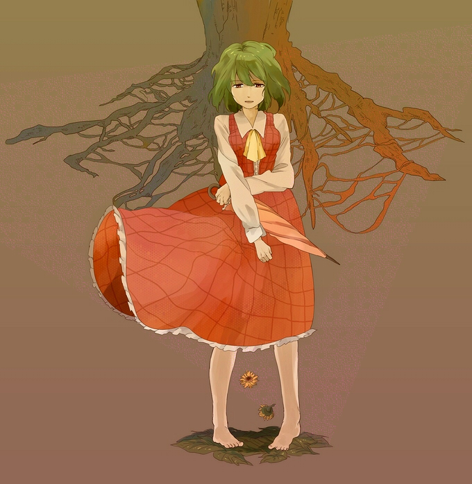 1girlascotbarefootclosed umbrellafemale focusflowergradient backgroundgreen hairplaid clothesplaid skirtplaid vestred eyesshort hairskirtskirt setsolosunflowertreeumbrellavest