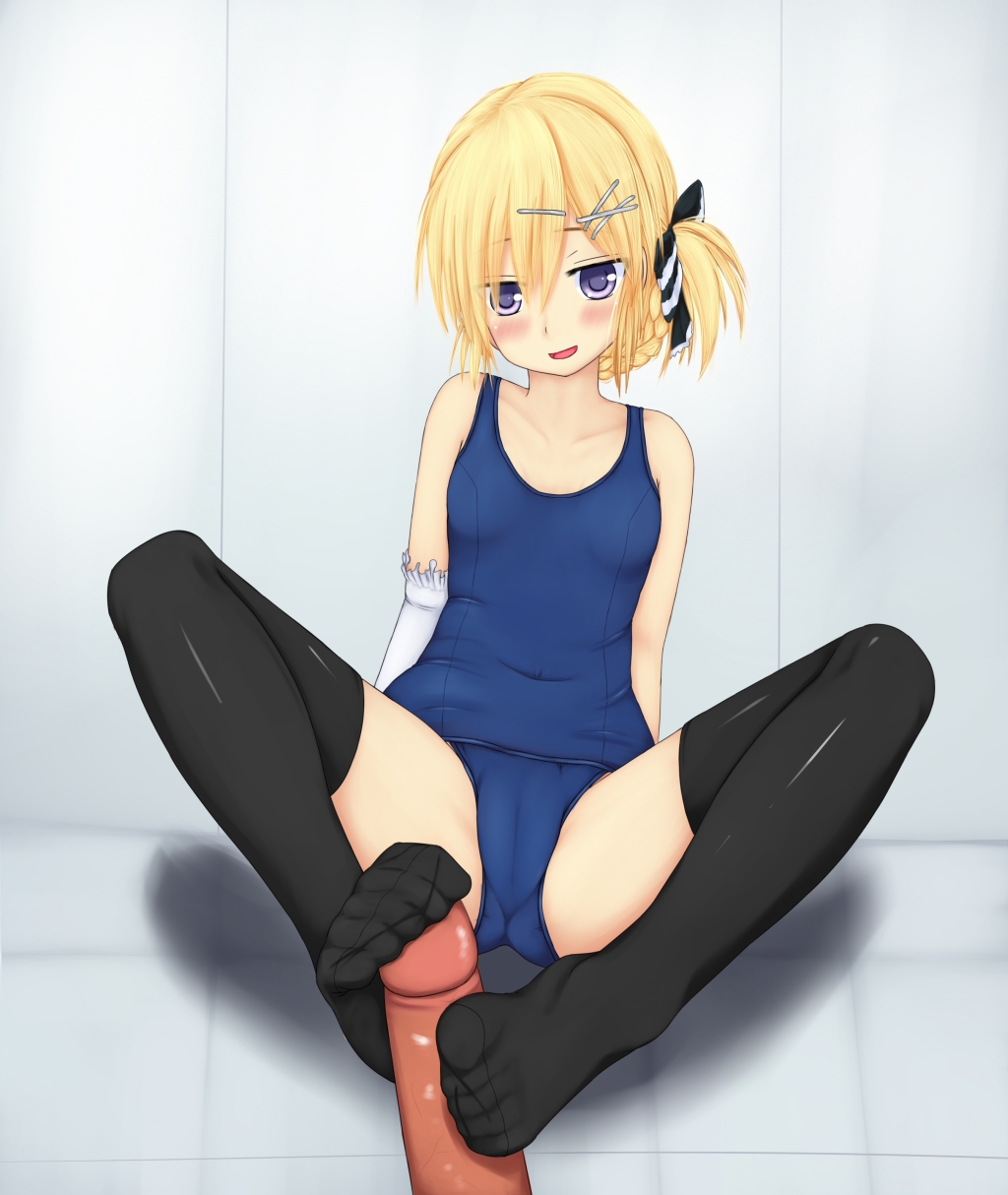 blonde hairelbow gloveelbow glovesfeetfemaleFlag for Deletionfootjobglovesno shoespenispurple eyessschool swimsuitsingle gloveswimsuitthighhighstoes
