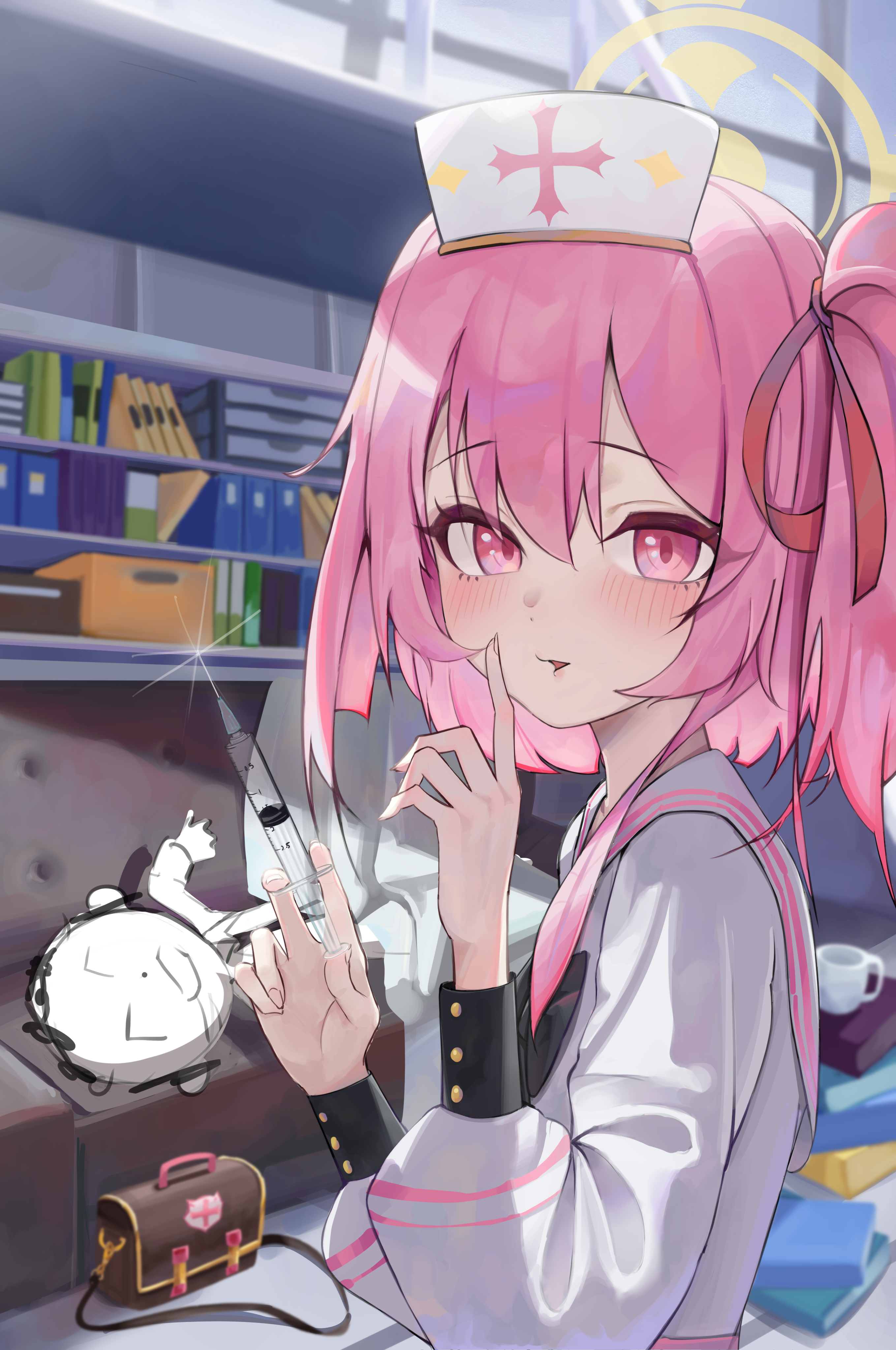 1boy1girlbacklightingblurryblurry backgroundblushbrown bagdressfeather hairfinger to mouthfrom sideglinthair between eyeshair ribbonhalohands uphatholdingholding syringeindex finger raisedindoorslong sleeveslooking at viewermedium hairnurse capone side upparted lipspink eyespink hairpuffy long sleevespuffy sleevesred ribbonribbonsailor collarschool uniformserafukushushingsolosyringeupper bodywhite dresswhite sailor collaryellow halo