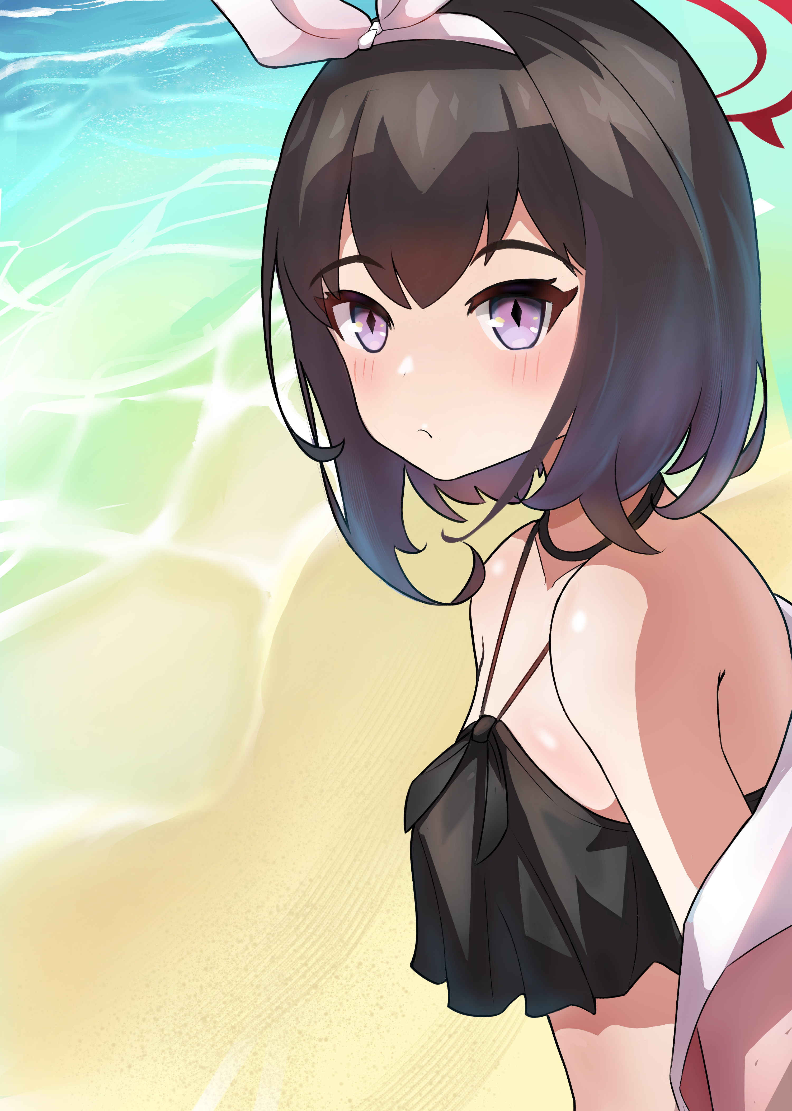 piyodera mucha, kotae (otomari koibito lolita), otomari koibito lolita, game cg, non-web source, 1girl, :o, ahoge, backpack, bag, black hair, black pantyhose, blue eyes, blue skirt, blue vest, buttons, collared shirt, cowboy shot, double-breasted, hair ribbon, hand up, long sleeves, looking at viewer, medium hair, neck ribbon, open mouth, pantyhose, pleated skirt, purple ribbon, ribbon, shirt, simple background, skirt, solo, tachi-e, transparent background, vest, white ribbon, white shirt
