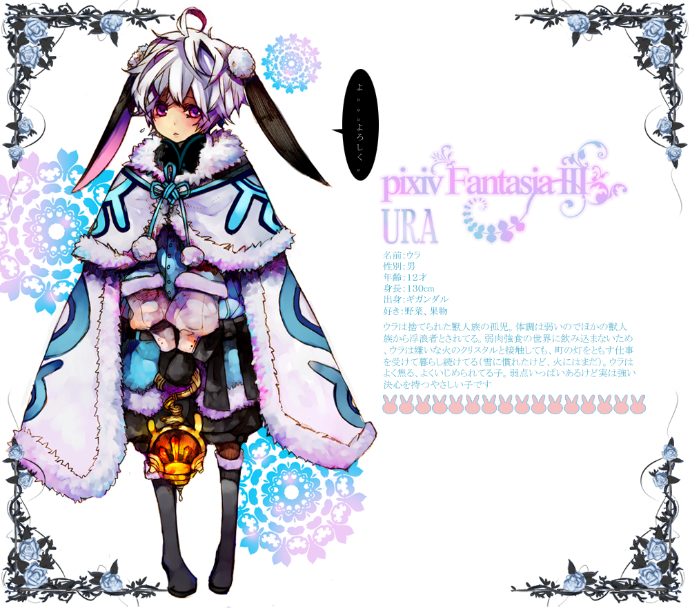 animal earsbootscapecharacter profilecoatgigandal federationglovespurple eyesred eyessolowhite hairwinter clothes