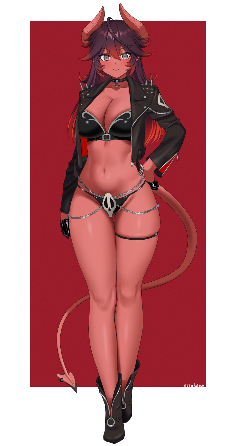 1girlblack bootsblack jacketbootsborderbreastschokercolored skincropped jacketdemon girldemon hornsdemon tailfull bodyglovesgradient hairgrey eyeshalf gloveshand on own hiphornsjacketleatherleather jacketlong hairlooking at viewermedium breastsmolemole on breastmole under eyemulticolored hairnavelpointy earsred backgroundred hairred skinshoulder spikesskindentationsmilesolospikestailthigh straptwo-tone hairwhite border