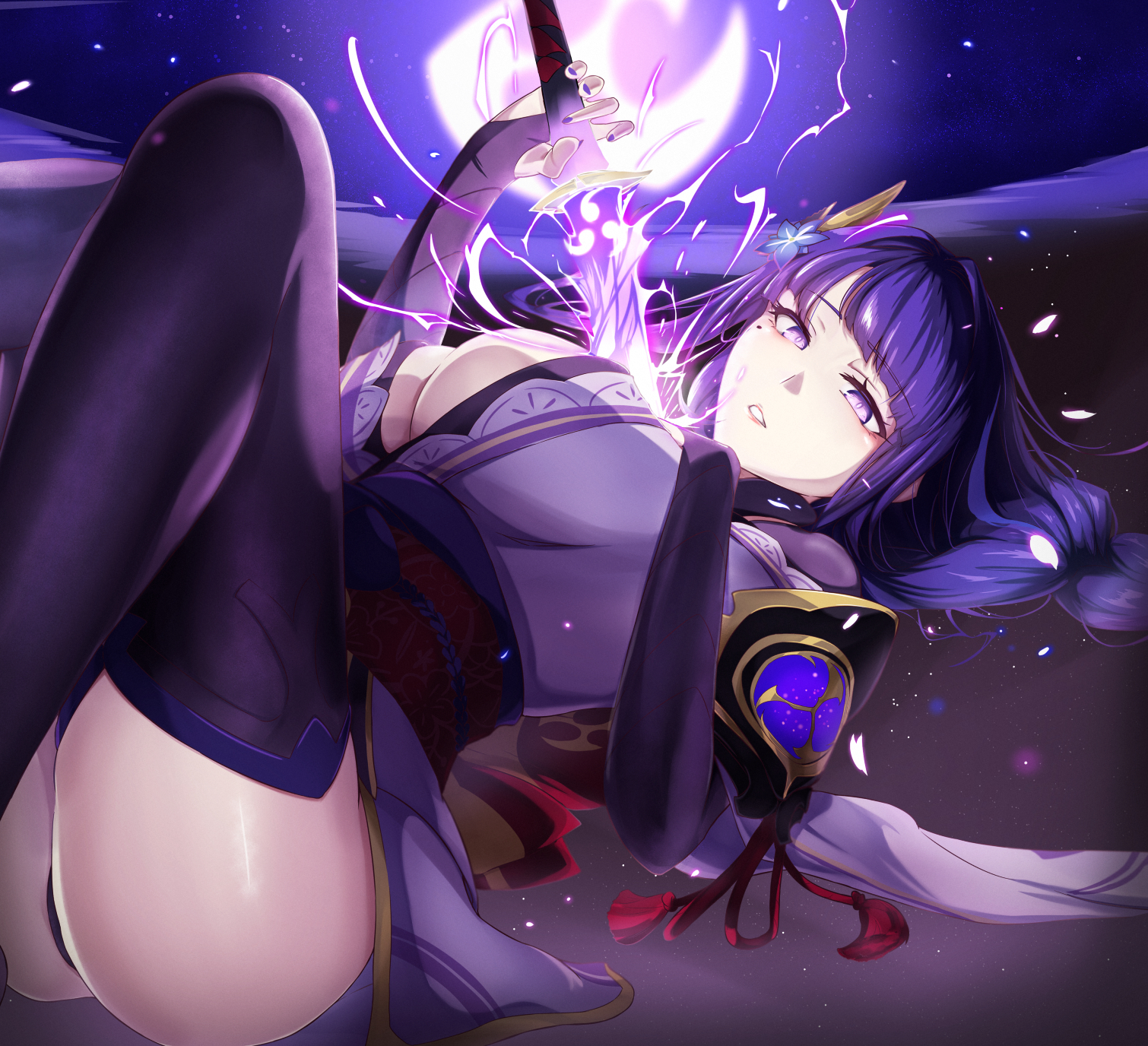 1girlarmorassass focusback bowblack pantiesblack thighhighsblunt bangsbowbraidbreastsbridal gauntletscleavagedrawing swordelectricityeyelinerflowerglowingglowing eyesglowing swordglowing weaponhair ornamentholdingholding swordholding weaponhuge breastshuman scabbardjapanese clotheskatanakimonolight particleslong braidlong hairlooking at viewerlooking to the sidelyingmakeupmitsudomoe (shape)molemole under eyemotion blurmulticolored hairmusou isshin (genshin impact)on backpantiesparted lipspink lipspurple backgroundpurple eyespurple hairpurple kimonopurple nailsred eyelinerred sashsashshadeshoulder armorsingle braidsolostreaked hairswordsword between breaststeeththighhighsthighstomoe (symbol)underwearweapon