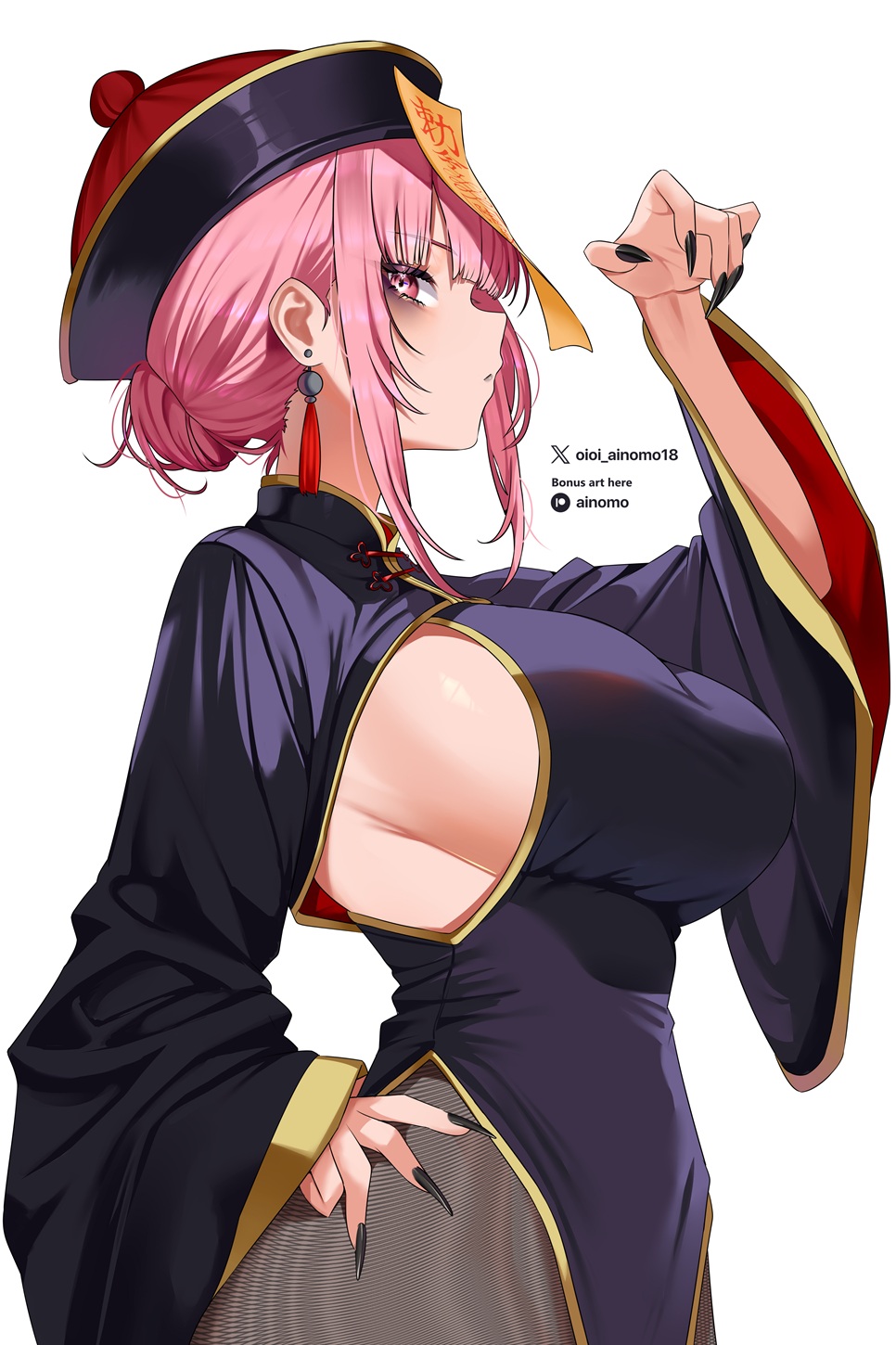 1girlalternate costumealternate hairstyleblack nailsbreastschina dresschinese clothesdressfingernailshair bunhatjiangshilarge breastslong fingernailslooking at viewernail polishofudaparted lipspink eyespink hairpurple dressqingdai guanmaoshort hairsimple backgroundsolotwitter usernametwitter x logovirtual youtuberwhite background