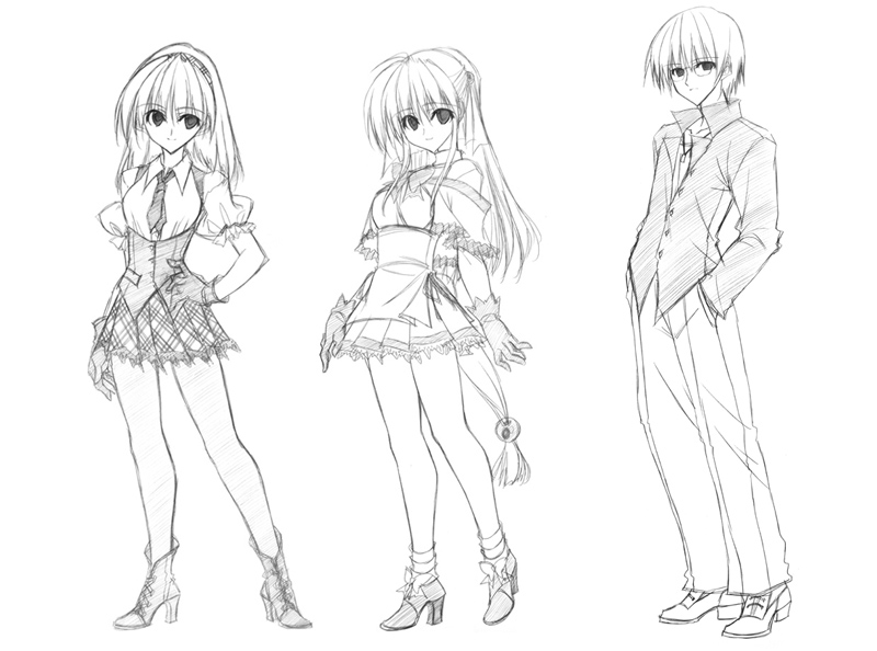 1boy2girlsformal clothesfull bodygreyscalelineartlooking at viewermonochromemultiple girlsnecktiepantspleated skirtsimple backgroundskirtstandingsuitwhite background