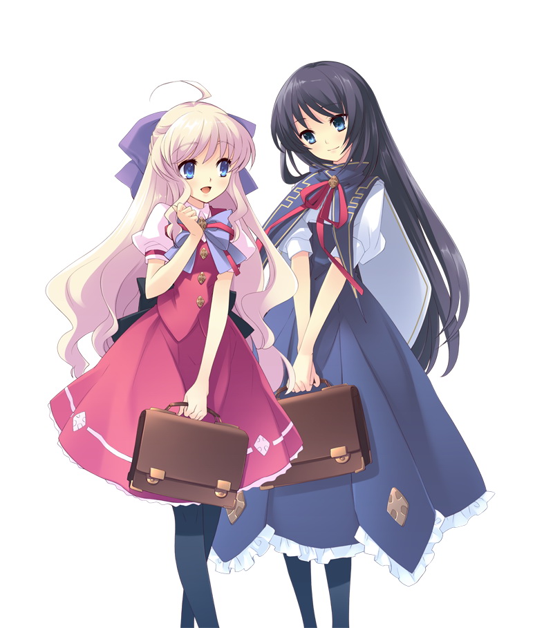 2girlsahogebagblack hairblue eyesbowhair bowlong hairmultiple girlspantyhoseschool bagschool uniformsimple backgroundsmile