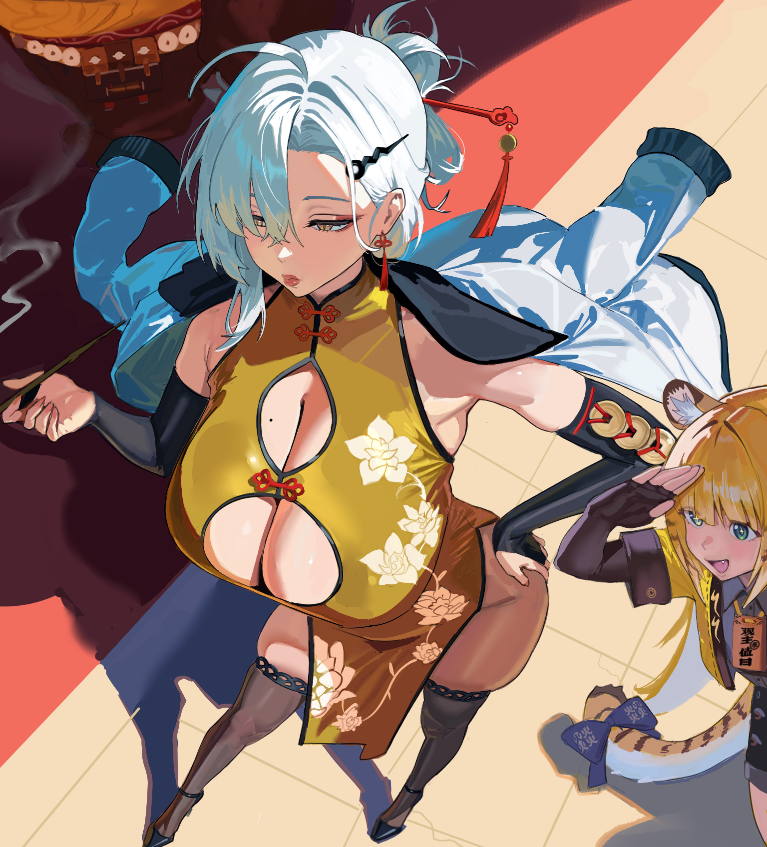 2girlsalternate costumeanimal ear fluffanimal earsbreastsbridal gauntletschina dresschinese clothescleavagecleavage cutoutclothing cutoutdetached sleevesdressfingerless glovesfrom abovegloveshair ornamenthair stickhand on own hiphigh heelshuge breastsjacketjacket on shouldersmolemole on breastmultiple girlsopen mouthsaluteskindentationstriped furtailthighhighstiger earstiger girltiger tailtile floortileswhite hairyellow eyesyellow jacketyin yang pin