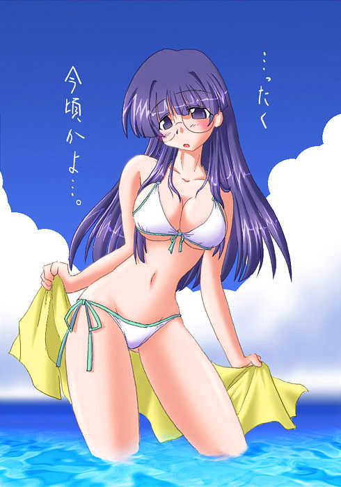 00s1girlbikiniblue eyesblue hairdayfemale focusfront-tie topglasseslong hairmatching hair/eyesside-tie bikini bottomsoloswimsuitwadingwaterwhite bikini