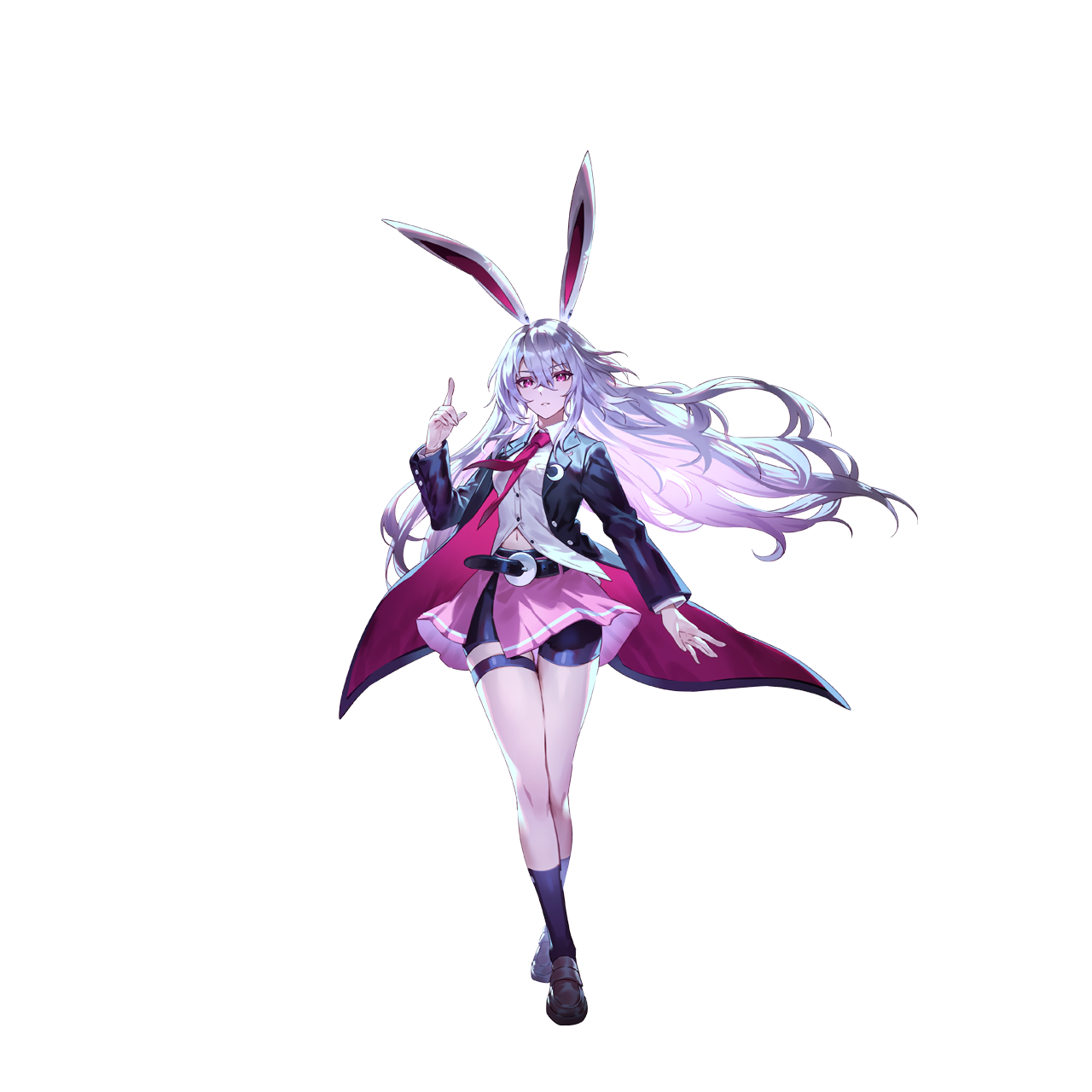 1girladapted costumeanimal earsbeltbike shorts under skirtblack beltblack jacketblack shortsblack socksbrown shoesbuttonsclosed eyescollared shirtcrescentcrescent pinfloating hairfull bodyhair between eyesjacketlong hairlong sleevesnavelnecktieopen clothesopen jacketopen mouthpink skirtpleated skirtpurple hairrabbit earsred eyesred necktieshirtshoesshortsside slitskirtsockssolothigh straptransparent backgroundvery long hairwhite shirt