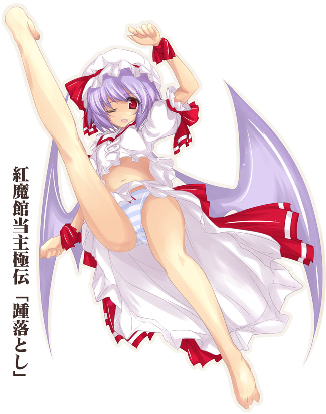 1girlbarefootbat wingsblue hairfeetfemale focusflexiblefull bodyhathigh kickkickingone eye closedpantiespurple hairred eyesribbonshort hairsimple backgroundsolostriped clothesstriped pantiesunderwearwingswink