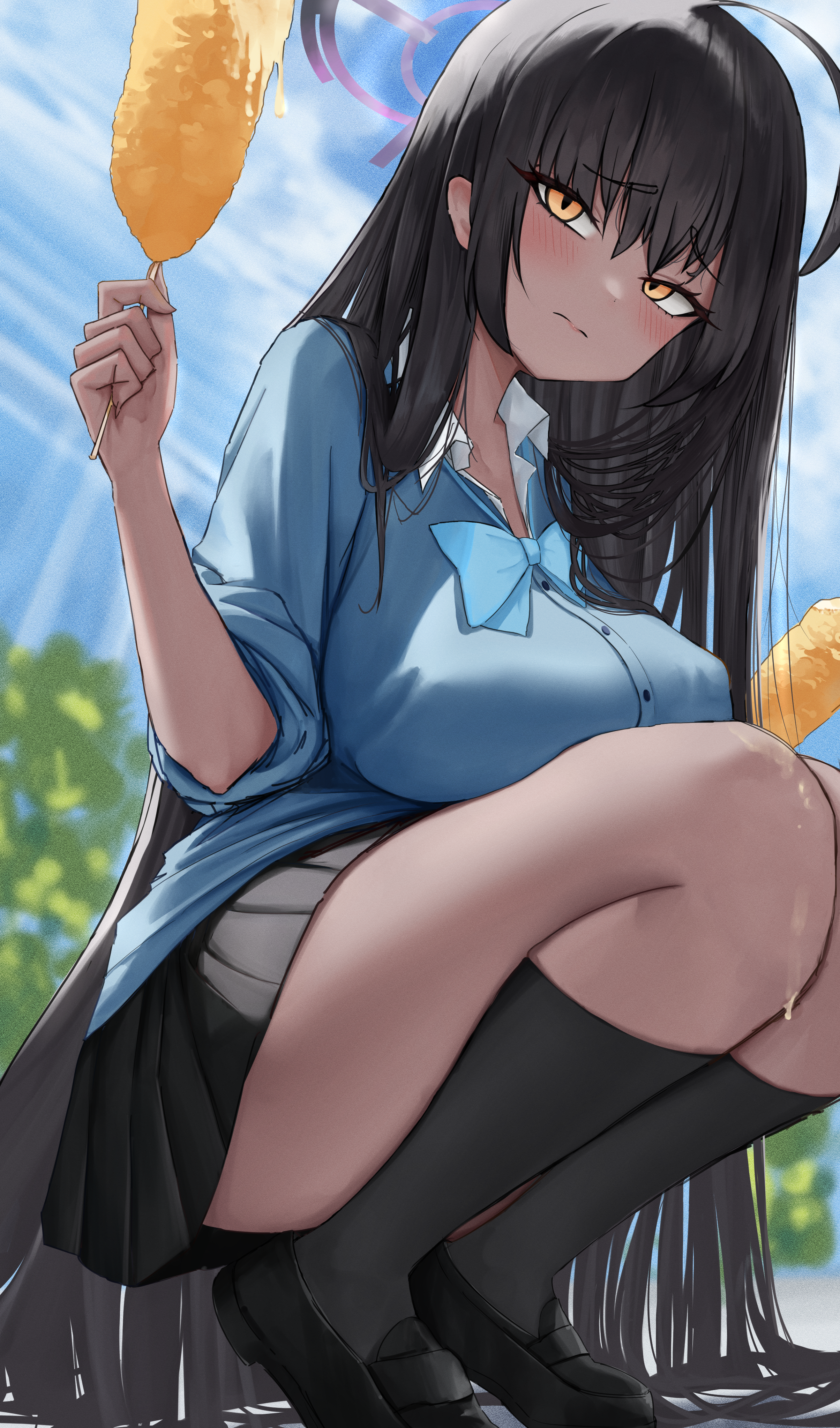 :31girlahogebacklightingblack hairblack shoesblack skirtblack socksblue bowblue bowtieblue cardiganblue skyblushbowbowtiebreastscardiganclosed mouthcollared shirtcorn dogcurvydark skindark-skinned femaledaydual wieldingfoodfrom belowfull bodyfurrowed browhair between eyeshair downhair over shoulderhalohands upholdingholding foodkneehighslarge breastslipsloaferslong hairlooking at viewerminiskirtofficial alternate costumeofficial alternate hairstyleoutdoorspleated skirtpurple haloshirtshoesskirtskysockssolosquattingstraight hairsunlightthighstsurimevery long hairwhite shirtyellow eyes