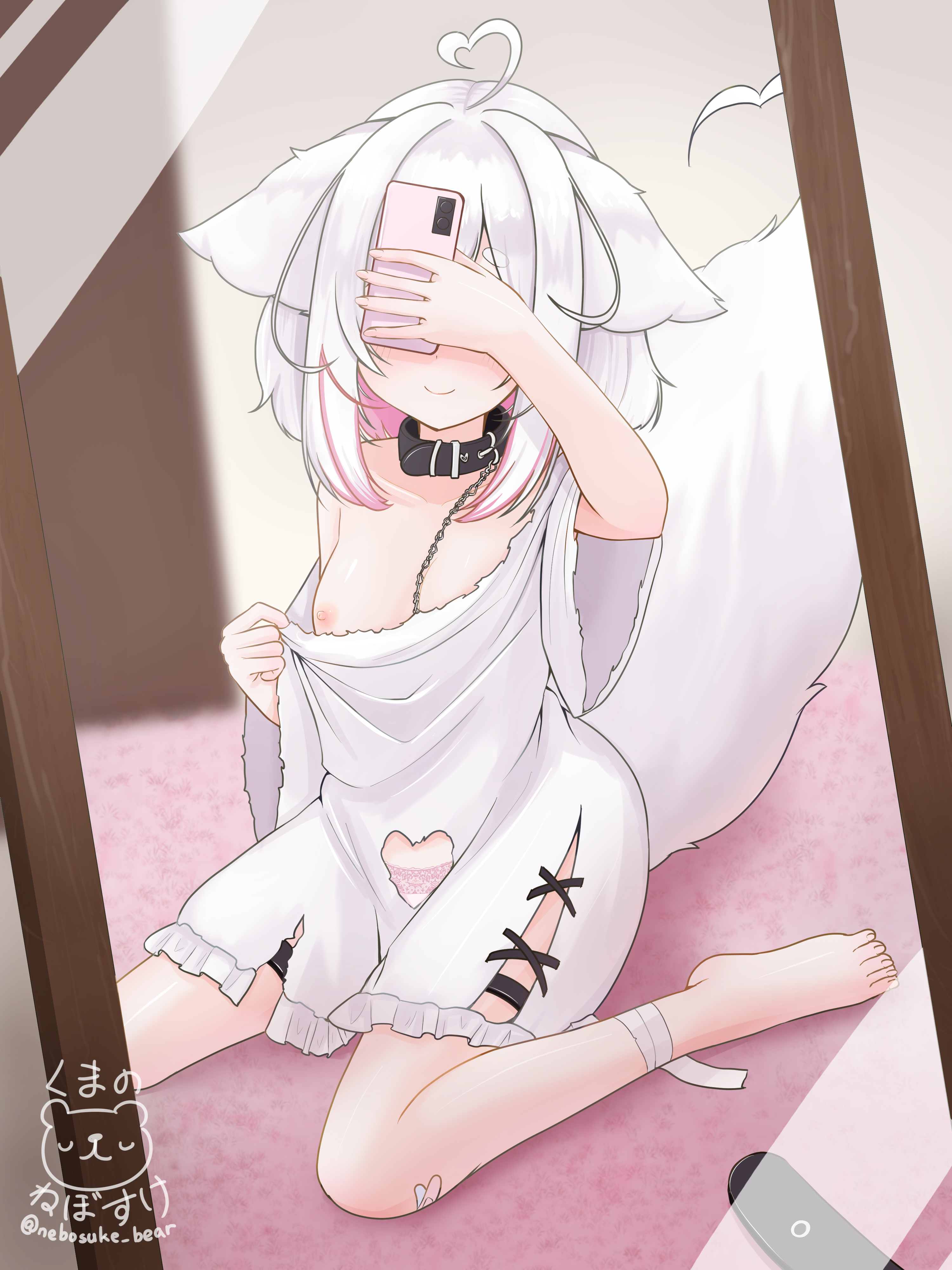 1girlanimal earsbandaged anklebreastscat earscat girlcat tailchainchain leashclothes pullclothing cutoutcollarcolored inner haircovered facecutout below naveldressdress pullfrilled dressfrillsleashmirrormirror selfiemulticolored hairpink hairselfiesmall breastssmilestreaked hairtailtorn clothestorn dresstwo-tone hairvirtual youtuberwhite dresswhite hairwide sleeves