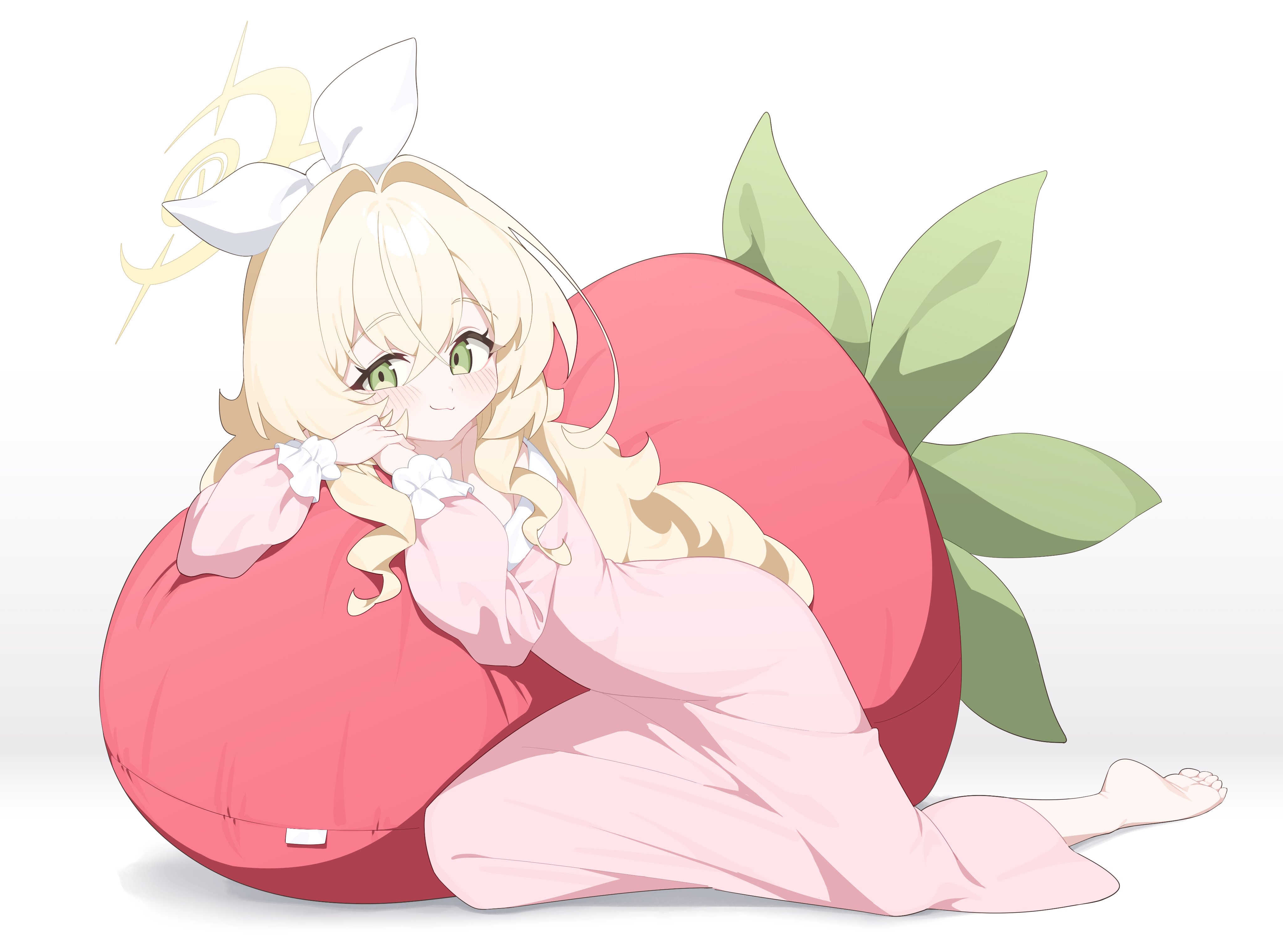 1girlalternate costumebarefootblonde hairblushclosed mouthfull bodygreen eyeshair between eyeshalolong hairlooking at viewerpajamaspink pajamassimple backgroundsolovery long hairwhite backgroundyellow halo