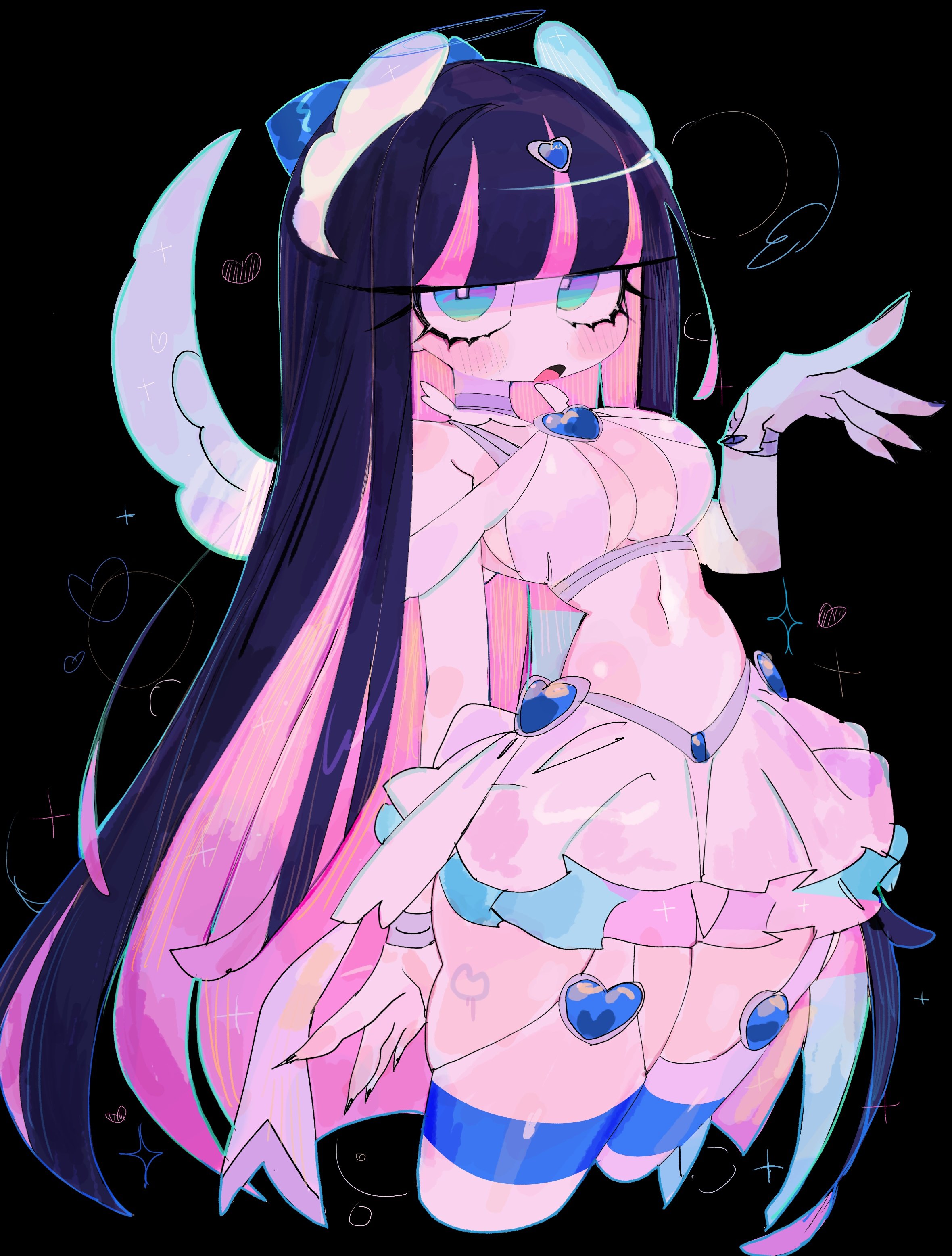 1girlangelangel wingsblack backgroundblue eyesblue hairblunt bangsbowbreastscolored inner haircropped legsdressfeathered wingshair bowhalolarge breastslong hairlooking at viewermulticolored hairopen mouthpink hairpurple hairsimple backgroundsolostriped clothesstriped thighhighsthighhighstraditional halotwo-tone hairwhite wingswings