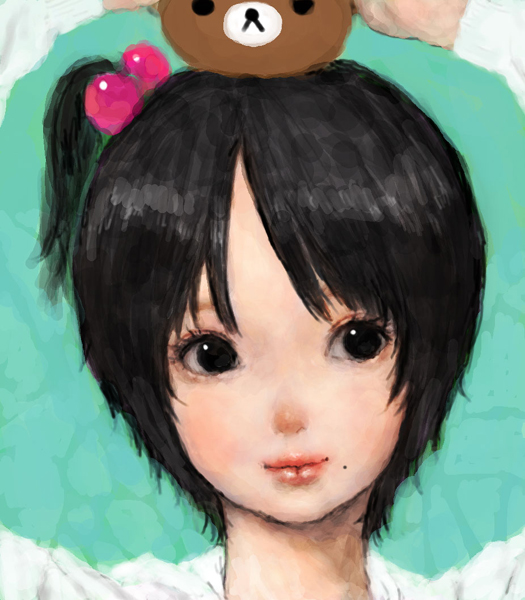 1girlblack eyesblack hairfacing viewerfemale focusmolemole under mouthportraitshort hairside ponytailsmilesolo