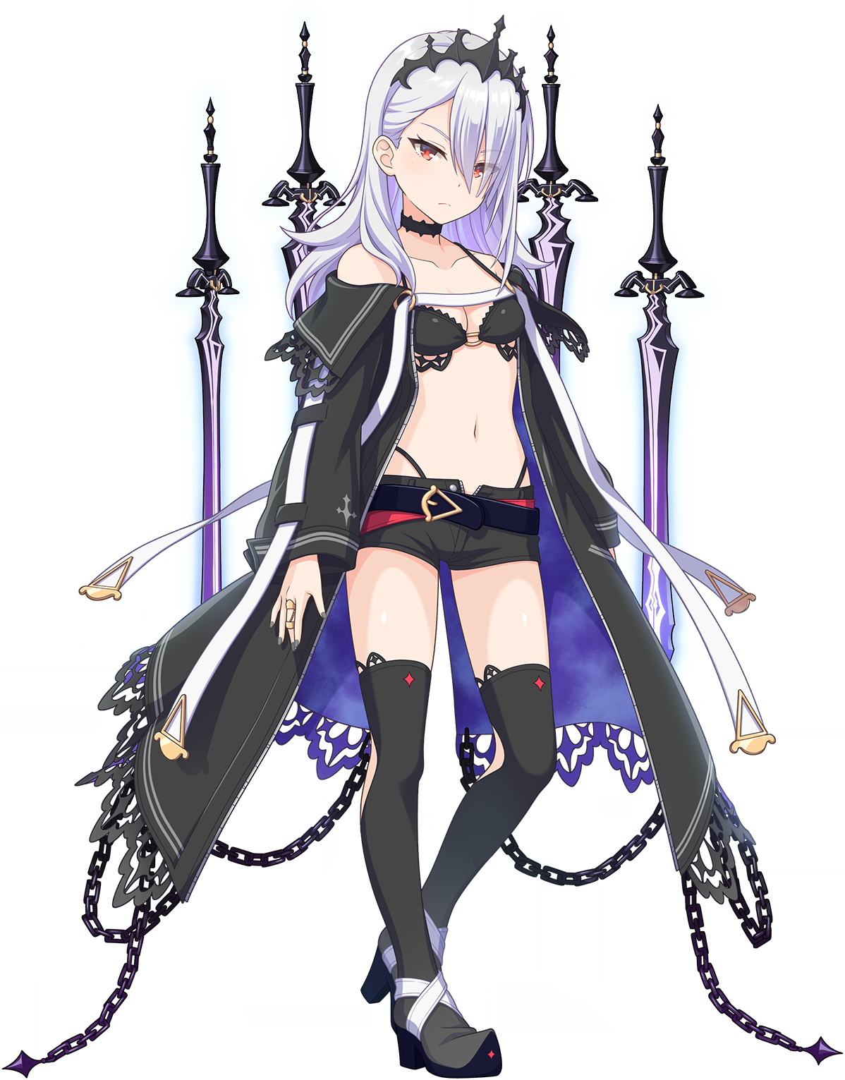 1girlblack bootsblack brablack capeblack pantiesbootsbrabreastscapechaincleavagecollarboneeyes visible through hairfloatingfloating objectfloating swordfloating weaponfull bodygrey hairhair over one eyehighleghighleg pantieslong hairlong sleeveslooking at viewernaveloff shoulderopen flypantiespanty strapspurple capered eyesseriousshort shortsshortssimple backgroundsolostomachswordthigh bootstransparent backgroundtwo-sided capetwo-sided fabricunderwearv-shaped eyebrowsweapon