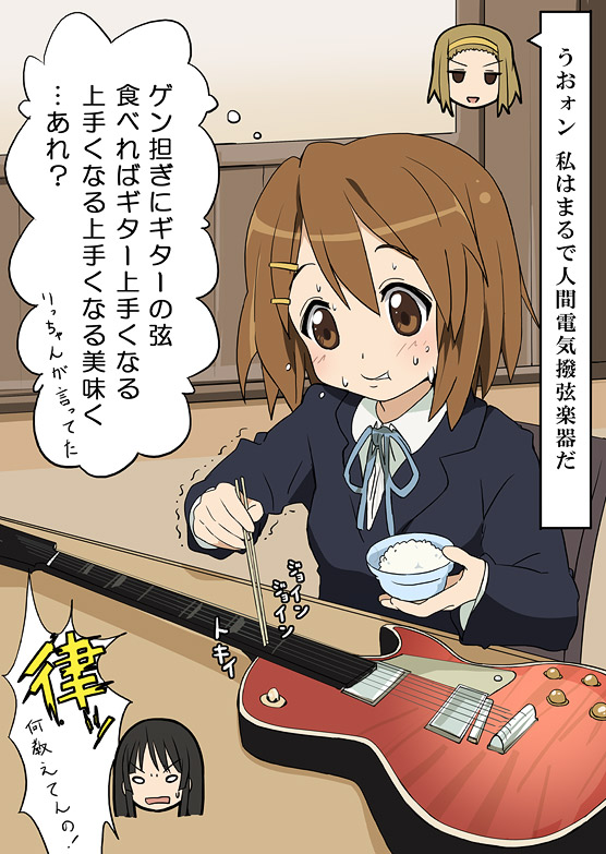 00s3girlsblack hairblazerbowlbrown eyesbrown hairchopstickselectric guitargibson les paulguitarhair ornamenthairbandhairclipi'm just like a human thermal power station (meme)instrumentjacketlong hairmememultiple girlspunriceschool uniformshort hairsweattrembling
