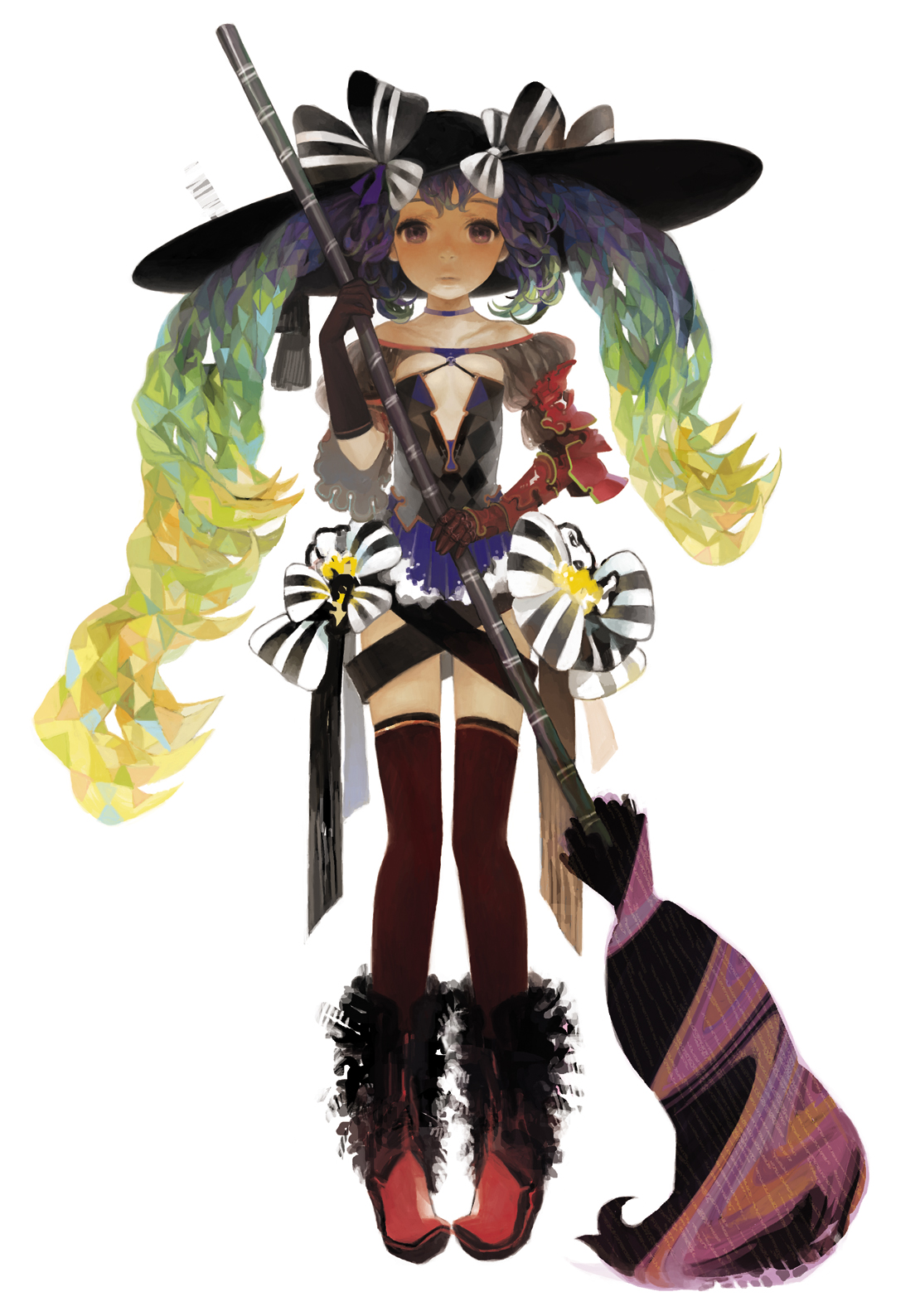 1girlasymmetrical hairblack eyesblonde hairblue hairbreastsbroomchildchokerexpressionlessfemale focusfull bodygauntletsglovesgradient hairgreen hairhatholdinglong hairlooking at viewermulticolored hairsimple backgroundsmall breastssolothighhighstwintailsuneven twintailswhite backgroundwitchwitch hat