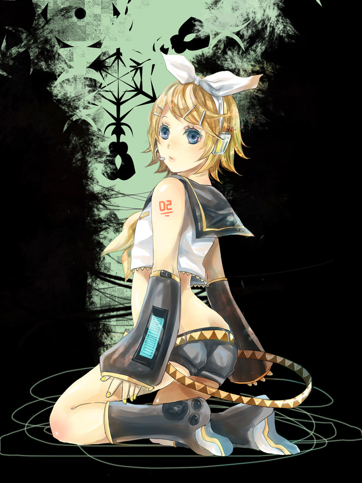 1girlassbare shouldersblonde hairblue eyesbutt crackfemale focusflat chestfull bodyhair ornamenthair ribbonhairclipheadphonesheadsetkneelinglooking backmidriffnail polishribbonsailorsailor collarschool uniformshort hairshortssittingsolotattoo