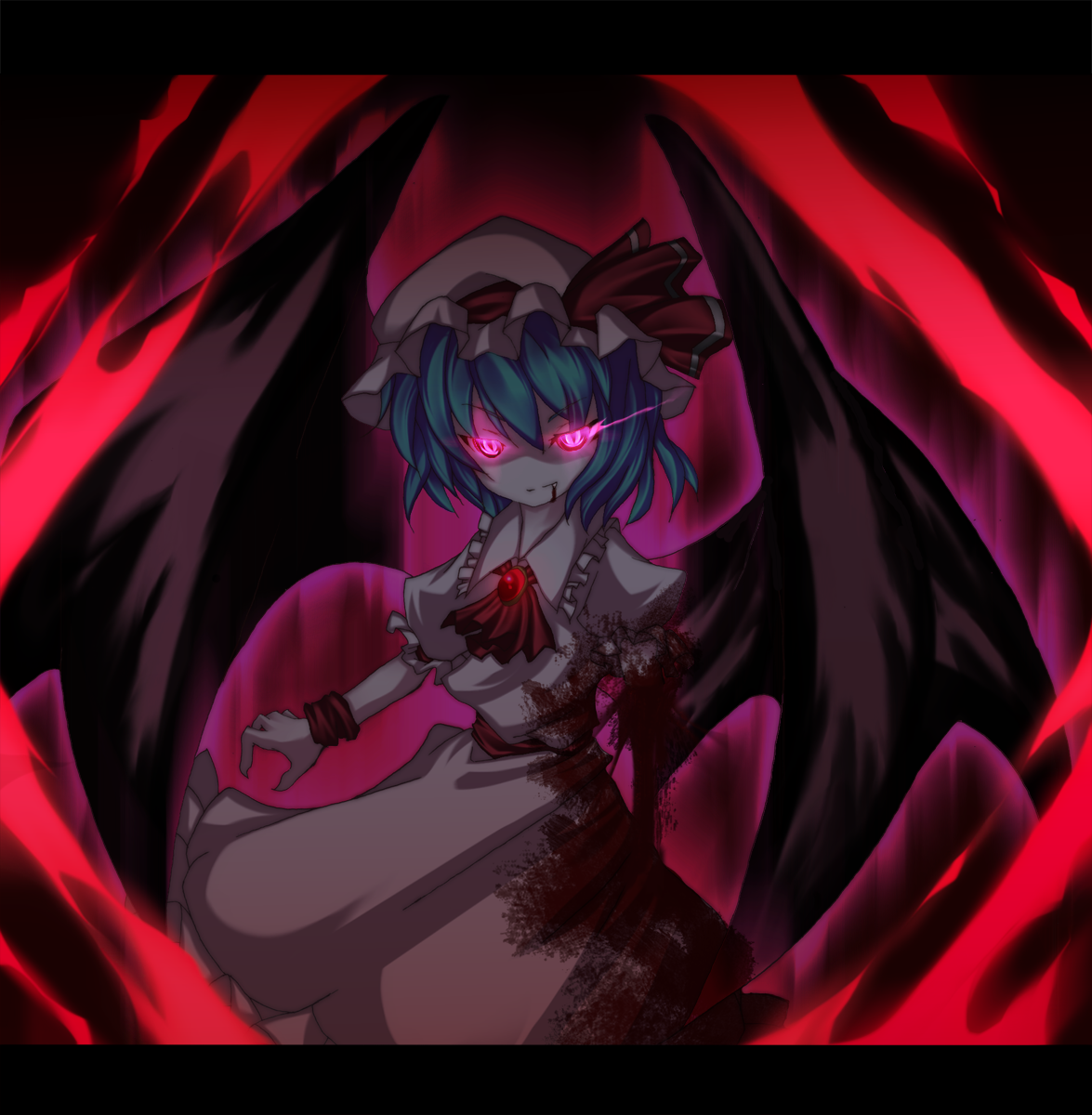 1girlamputeeascotbat wingsbloodblood on clothesblue hairbroochfangfemale focusglowingglowing eyesgurohatinjuryjewelryred eyessevered limbshort hairsolowings