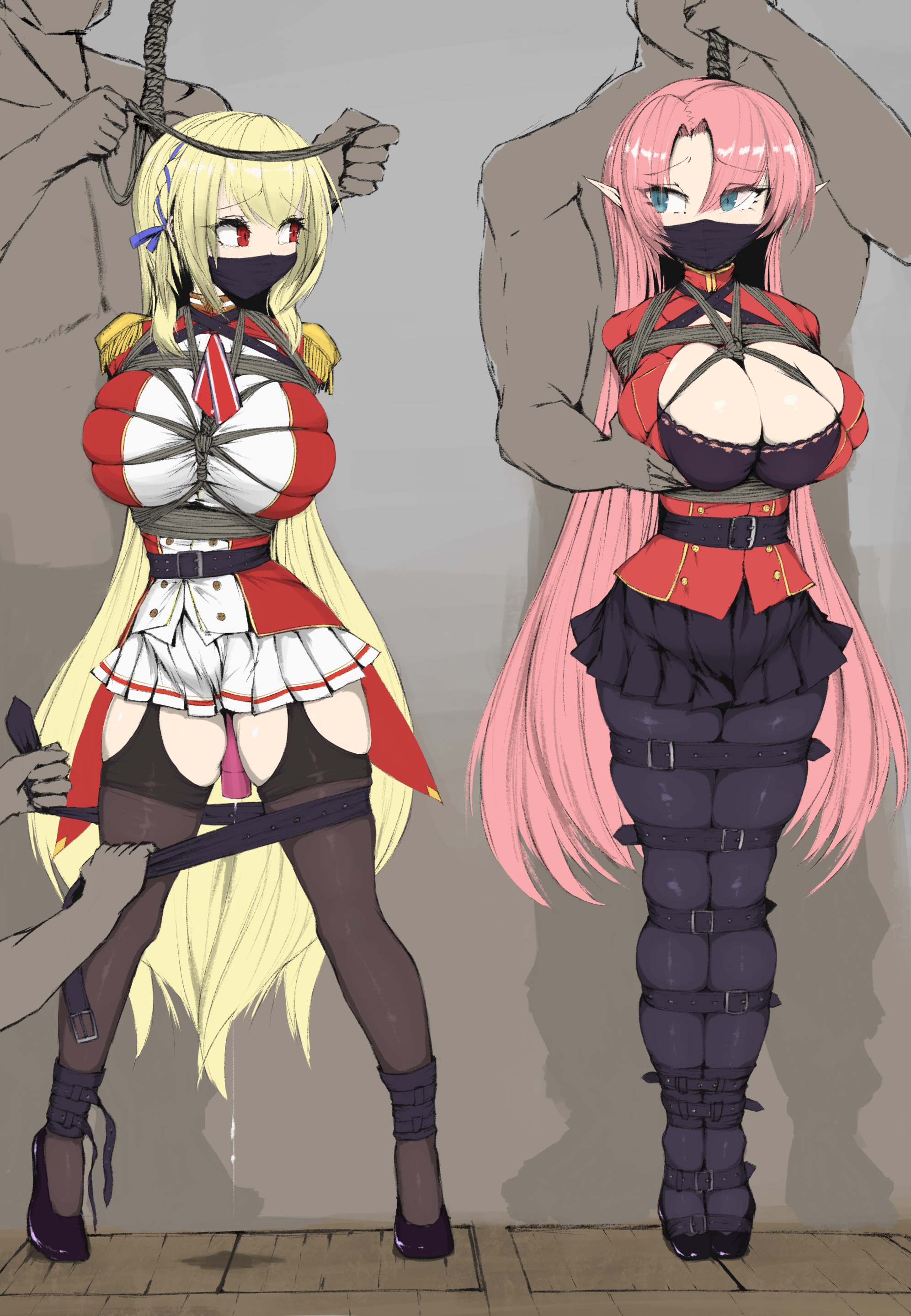 2girlsblack pantyhoseblack skirtblack thighhighsblonde hairblue eyesbreastscleavagedildogallowsjacketlarge breastslong hairminiskirtmultiple girlsobject insertionpantyhosepink hairpleated skirtred eyesred jacketrestrainedsex toyshibarishibari over clothesskirtthighhighswhite skirt