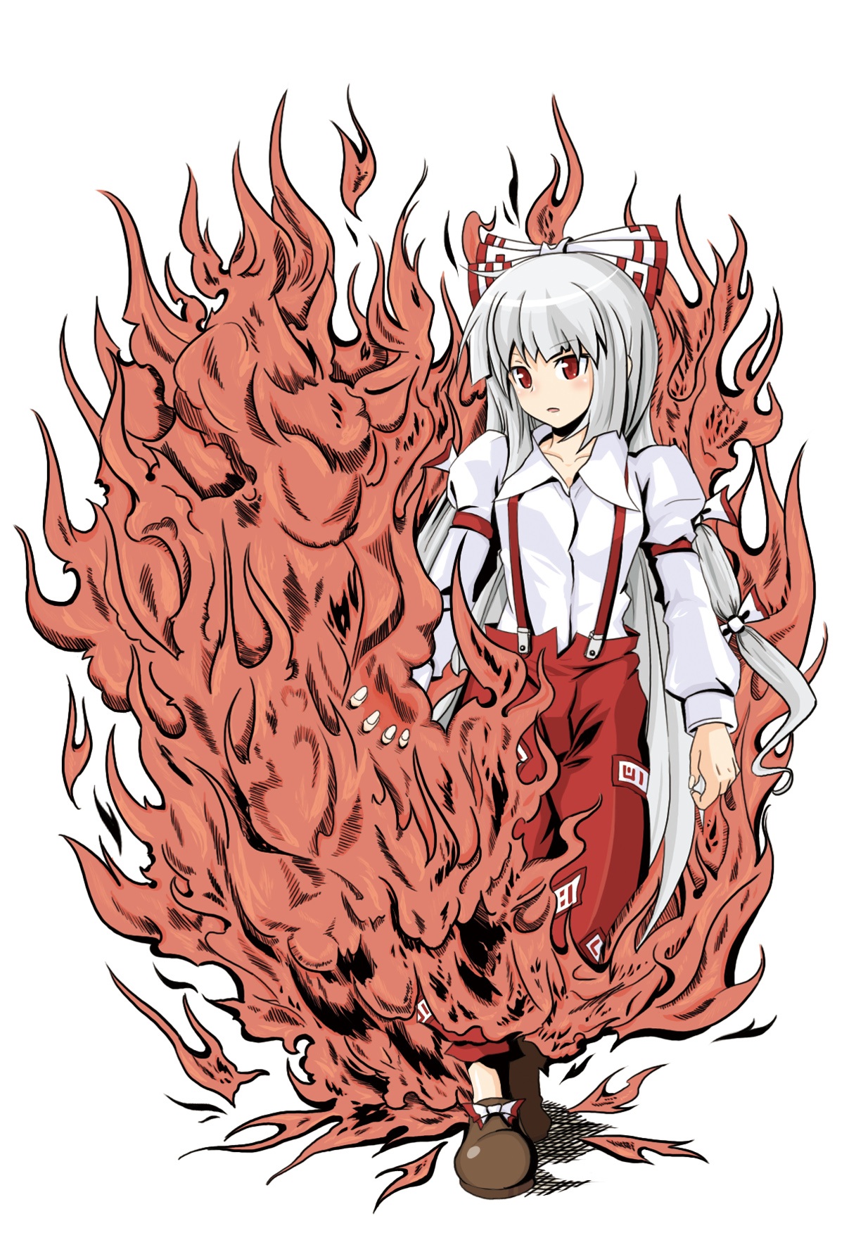 1girlbowfemale focusfireflaming handhair bowlong hairred eyesribbonshoessimple backgroundsockssolosuspenderswalkingwhite backgroundwhite hair