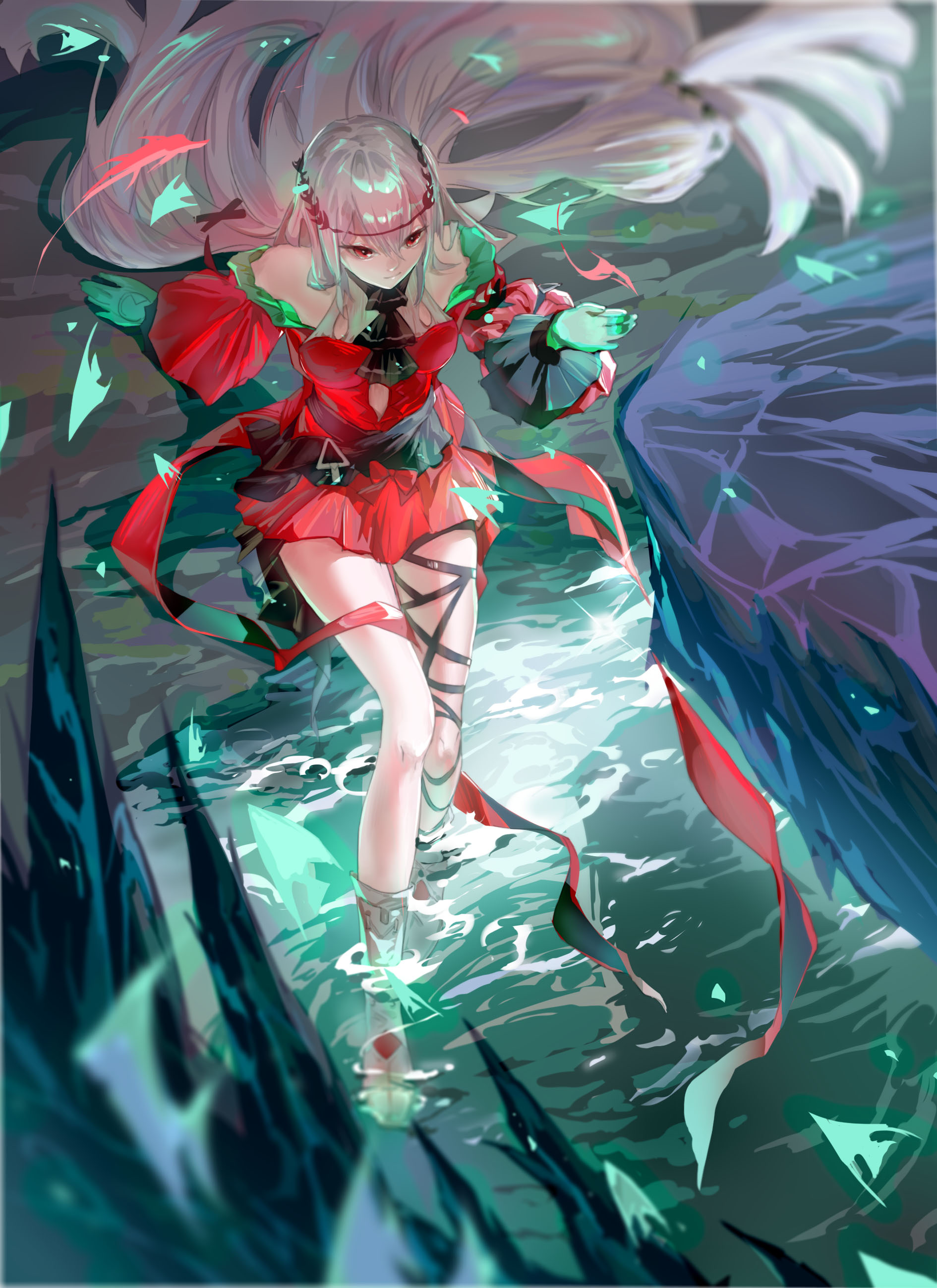 1girl1otherangelfishaqua glovesascotbare shouldersblack ascotblurryblurry edgesblurry foregroundbreastsclothing cutoutdetached sleevesdressfishflying fishfrom abovefull bodyglovesgrey hairhair between eyeshair ribbonleg ribbonlong hairlong sleevesmedium breastsmonsternavel cutoutoff shoulderoff-shoulder dressofficial alternate costumepartially submergedred dressred eyesred ribbonred sleevesribbonsittingsolosteelblue867058tropical fishvery long hairwater