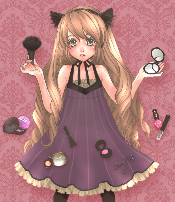 00s1girlanimal earsblushcosmeticsdresseyelash curlerfemale focusgreen eyesmakeupmakeup brushmirrornail polish bottlepantyhoseperfume (cosmetics)solo