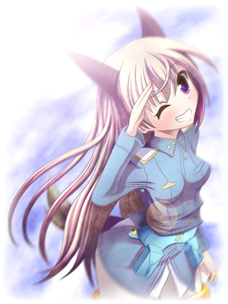 00s1girlanimal earsfemale focusgrinlong hairmilitarymilitary uniformone eye closedpantyhosepurple eyessalutesmilesolowhite pantyhosewink