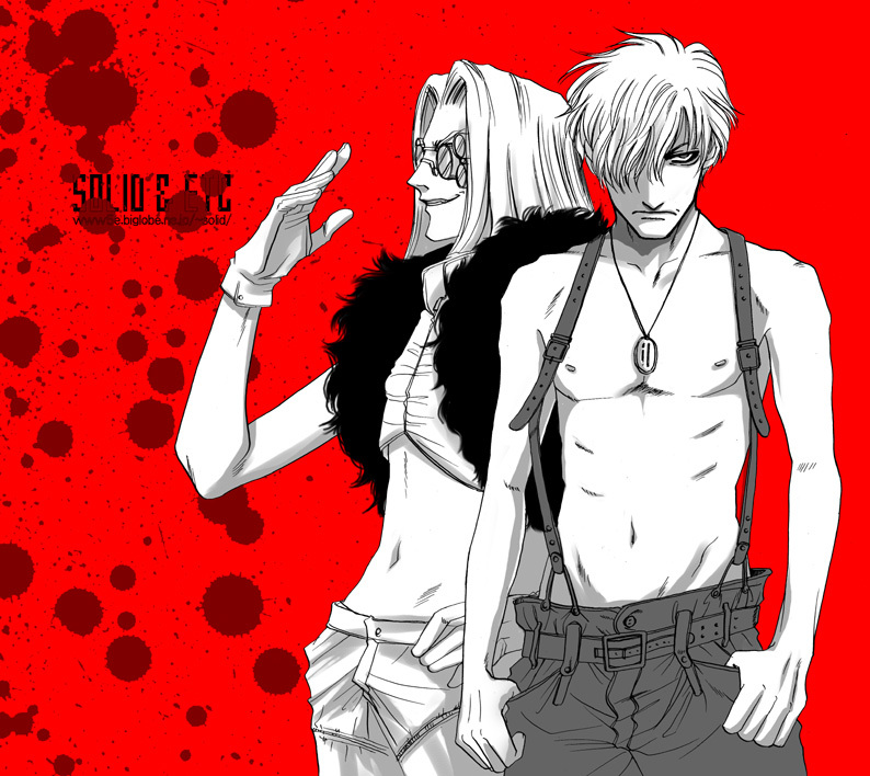 2boysabsbellybeltfeather boafrownglassesgloveshair over one eyejewelrymidriffmonochromemultiple boysnavelnazinecklacepantsred backgroundshort hairsmilesuspenderstopless male