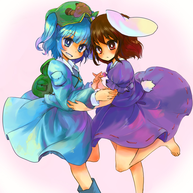 2girlsanimal earsbackpackbagbarefootblue eyesblue hairbrown hairfeetfemale focushatkeymultiple girlspooprandoserured eyesshort hairtailtwintailstwo side up