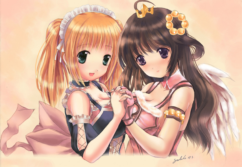 2girlsarmletbreast pressbreastsbrown haircrowndetached sleevesfingerless glovesglovesgreen eyesjewelrylarge breastsmaidmultiple girlsorange hairpurple eyessymmetrical dockingtwintailswings