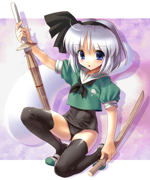 1girlblack one-piece swimsuitblue eyesbokkenchildfemale focusfull bodyhairbandhitodamano pantsone-piece swimsuitribbonschool swimsuitshinaisoloswimsuitswimsuit under clothesswordthighhighsweaponwooden sword